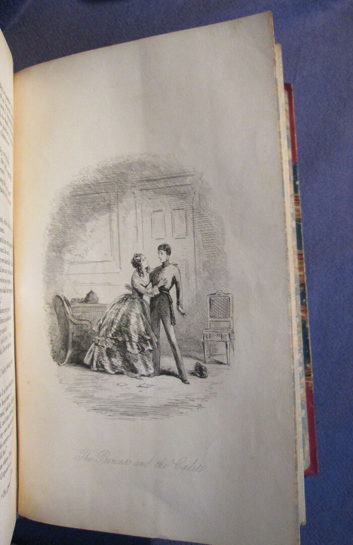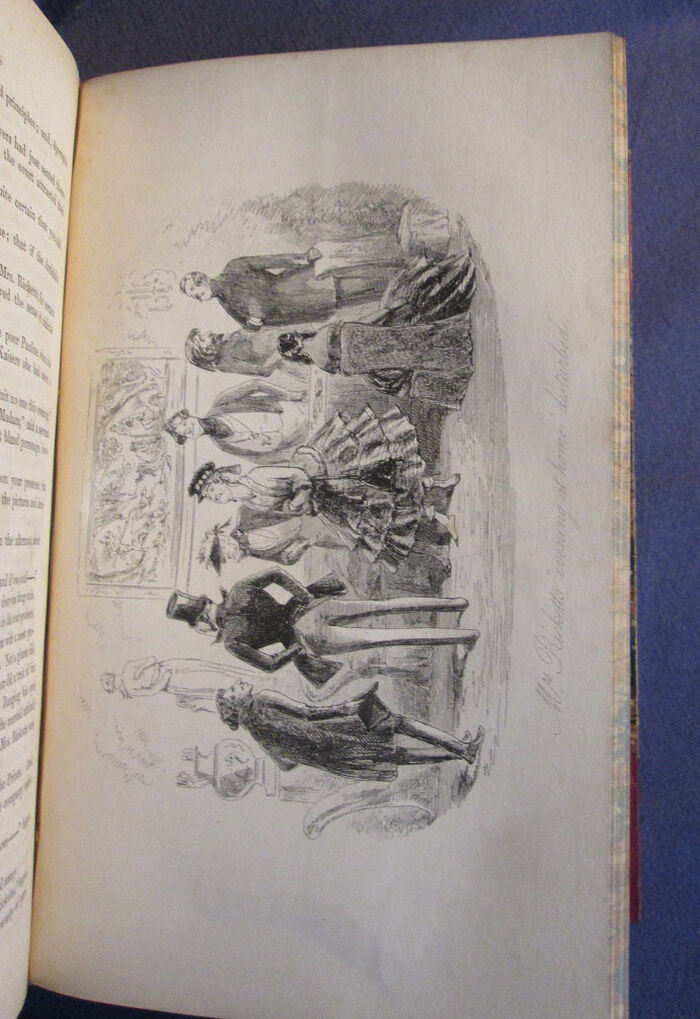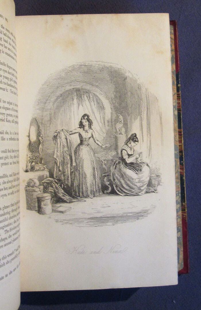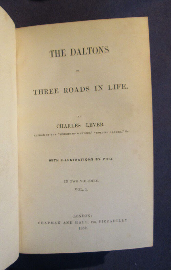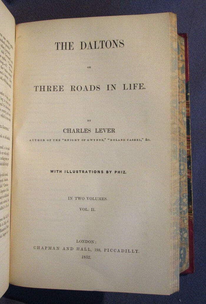 Hardback. First edition, two volumes bound in one, half leather binding. viii,384pp.+v,360pp. Lavishly illustrated by Phiz with nearly 50 pictures. Black and white frontis and vignette to title page and 24 plates (vol I) and 22 further plates (vol II). Red leather is spine and corners with gilt titles to spine on black label slightly faded, gilt banding and decorations to spine, gilt borders to edge of leather corners, marbled papers to boards. Marbled page edges. Marbled endpapers.