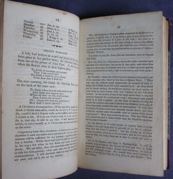 Hardback. 152+152pp. Rev William Carus Wilson vicar of Rector of Whittington, Rector of Tunstall, Lancashire and chaplain to HRH the Duke of Sussex was a prolific writer for his two periodicals the The Friendly Visitor and The Children's Friend. Tunstall was the parish church which was attended by the clergymen’s daughters of the school of Cowan Bridge including the oldest four Brontë sisters: Maria, Elizabeth, Charlotte and Emily. The church is famously described in Jane Eyre as Brocklebridge Church and Rev Carus Wilson features in Jane Eyre as Mr Brockleurst. Half bound in maroon leather with marbled papers to the side and marbled endpapers. Horizontal bands of gilt to the spine. Gilt title to the spine. Ruled in gilt to edges of the leather.