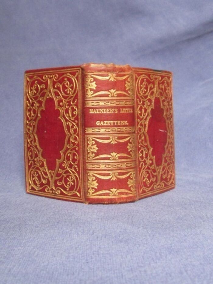 Hardback. Attractively bound, miniature book in decorated cloth: 80 by 55mm (3¼ by 2¼ inches). “Describing the Situation, Extent, and Other Topographical Features, With the Commerce, Manufactures, Productions, and General Statistics, of Every Country in the World: To which are added. A Comprehensive Population Table, and a List of the Cities, Boroughs, etc. of England and Wales, Corrected up to the Present Time.” xvi,786pp. plus population tables and other addenda. First few preliminary pages (not main text) have been torn out so it lacks front endpaper, title pages etc. The text is complete and the book starts with an advertisement and then the first page of the introduction. Original red cloth with gilt titles to spine and gilt decorations to spine and to both boards. All edges gilt.