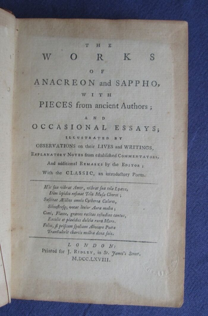 The Works of Anacreon and Sappho, With Pieces from Ancient Authors; and Occasional Essays; Illustrated by Observations on their Lives and Writings, Explanatory Notes from established Commentators, and additional Remarks by the Editor; With the Classic, an introductory poem.
