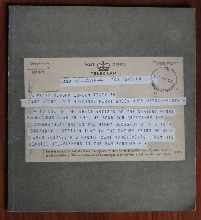 Paperback. Catalogue accompanying a small exhibition of works by Henry Moore as a tribute to the artist on the occasion of his 70th birthday on 30th July 1968. Covers sculptures, sketches, lithographs, etc. Unpaginated. Black and white illustrations throughout. 225 by 210mm (8¾ by 8¼ inches).
