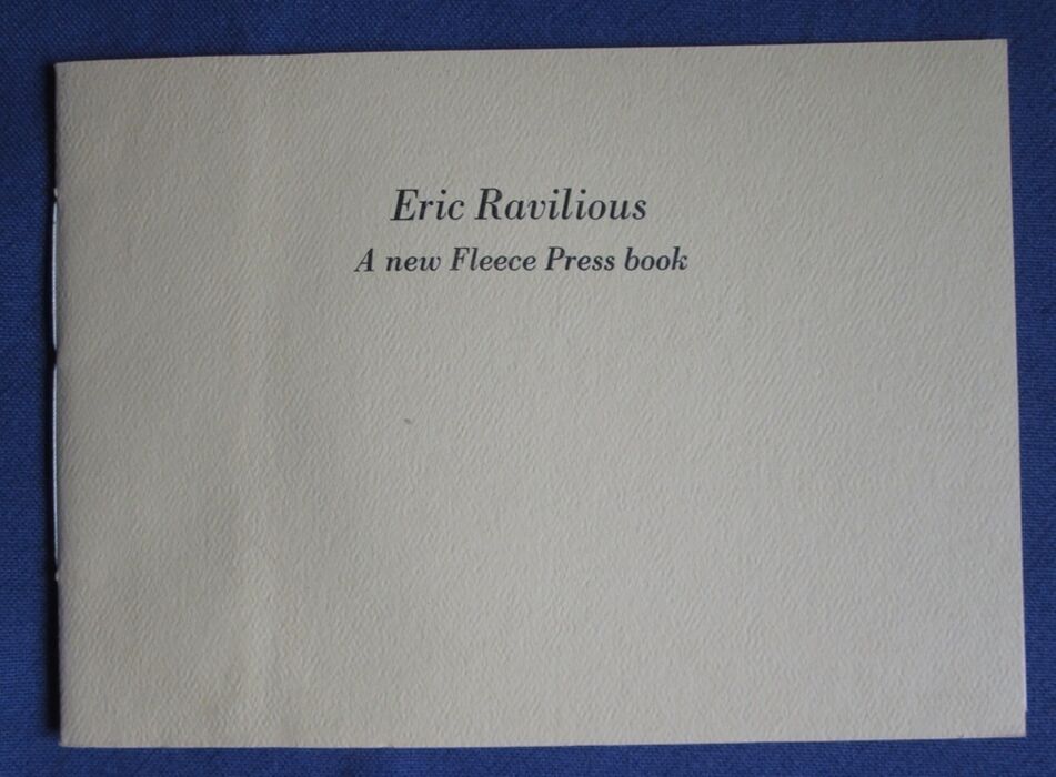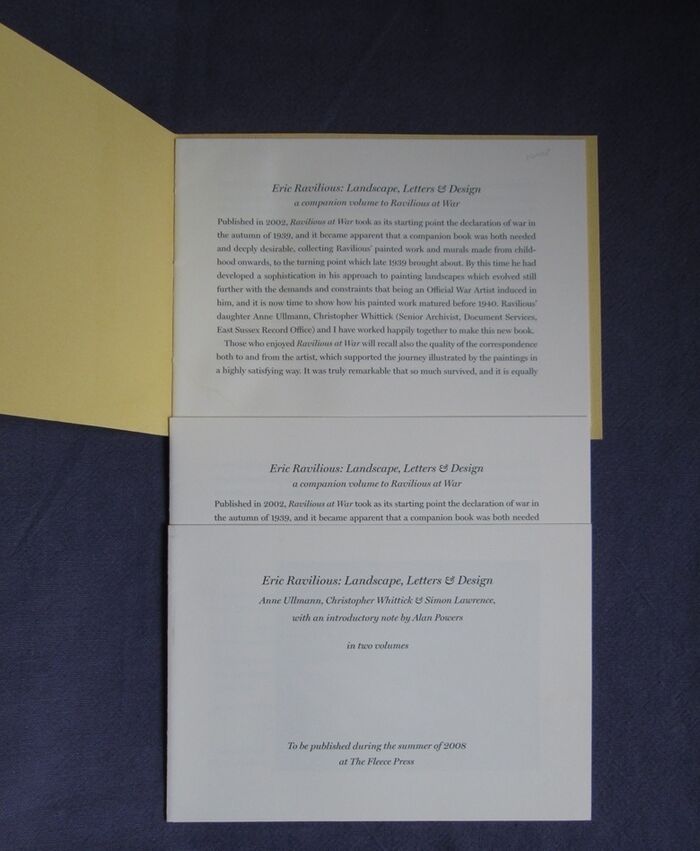 Pamphlet 8pp including one black and white illustration. Sewn binding in yellow card printed ‘ Eric Ravilious / An new Fleece Press Boo’. Loosely enclosed is an complete repetition of the 8 page text . Also loosely enclosed a flyer/order form with a colour illustration’ Two women in a Garden’ - one page folded in the same landscape format. Note: this is prospectus not the actual book.