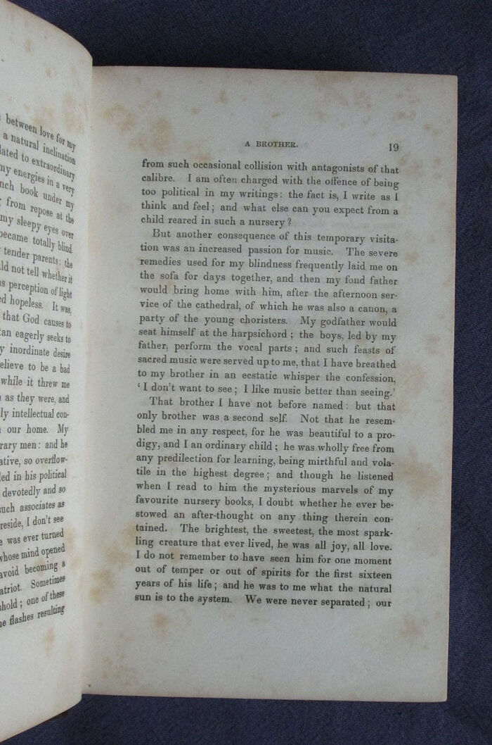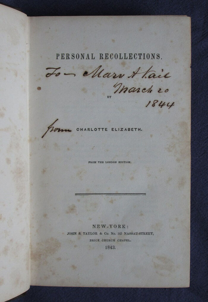 Hardback. 357pp. Inscribed by the author, dated March 1844. Described by Dr Teresa Walker as “part personal memoir, part travelogue and part near fiction. Moreover, her memoirs give us a fascinating glimpse into the life of an extraordinary woman — a woman with a social conscience and a number of causes to champion — living at a time of great social change and progress”. This the memoir of writer Charlotte Elizabeth (born Browne, then Phelan and later Tonna) who used the pen name Charlotte Elizabeth to escape her abusive first husband. English born Charlotte Elizabeth married an Irishman, and began her writing career in Dublin. She wrote extensively on women's rights as well as in the service of evangelical Protestant thought as well as children’s stories. Very hard to find anything inscribed by Tonna. First US edition. Tonna wrote only under her Christian names as she wish to hide her income from her abusive then-husband, Phelan which prior to the Married Women's Property Act 1882 would have belonged to him.