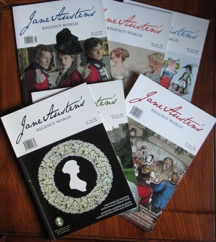 Six paperback issues of the periodical Jane Austen's Regency World. This is the full set for 2017. Issues : Jan/Feb, May/Jun, Jul/Aug, Sep/Oct, Nov/Dec. Each issue is 64pp. Colour illustrated throughout with articles on Jane Austen’s life and work and the places she knew. Also covers other items of Regency interest such as the Lady Worsley scandal (the BBC dramatised it as The Scandalous Lady W), in issue Jan/Feb. We have lots of other issues of Jane Austen's Regency World in stock.