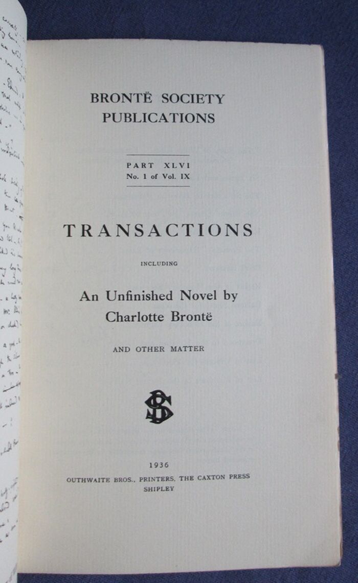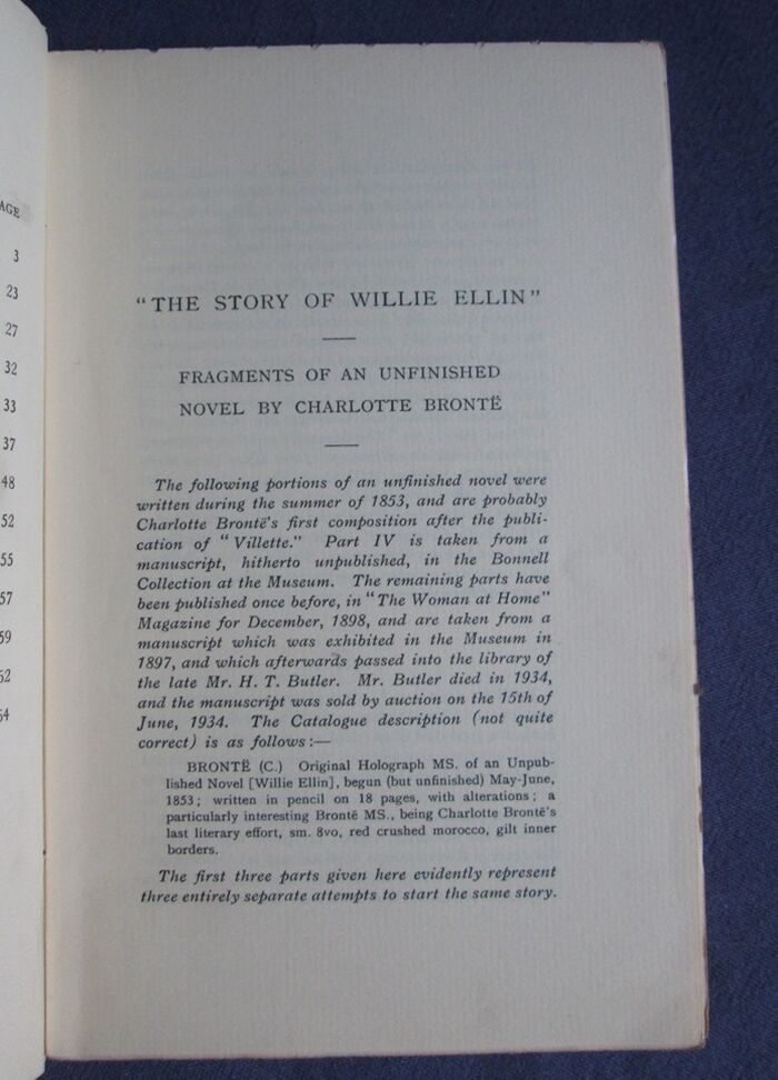 The Story of Willie Ellin - An Unfinished Novel by Charlotte Brontë in Brontë Society Transactions 1936 Part XLVI No 1 Volume IX