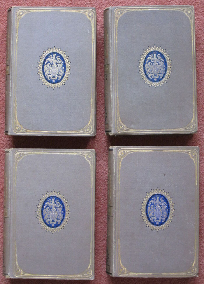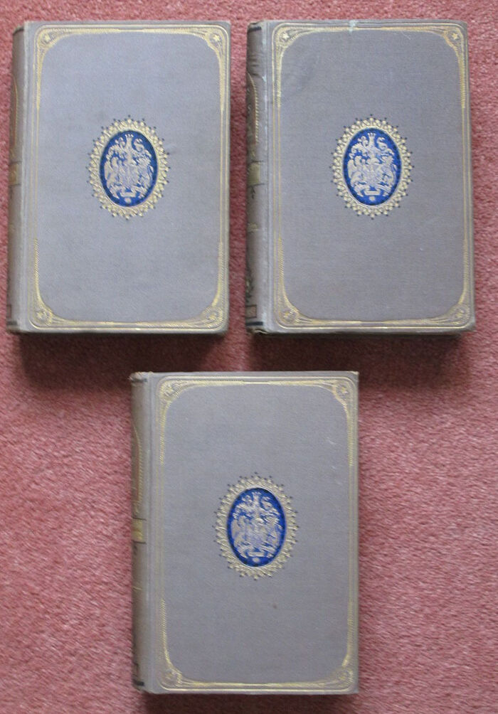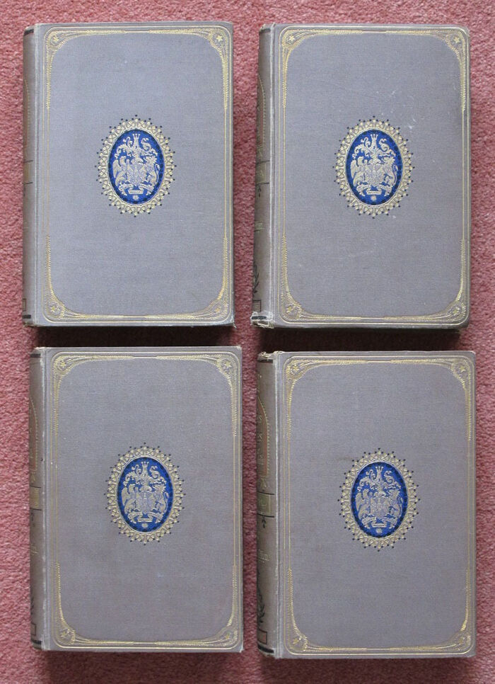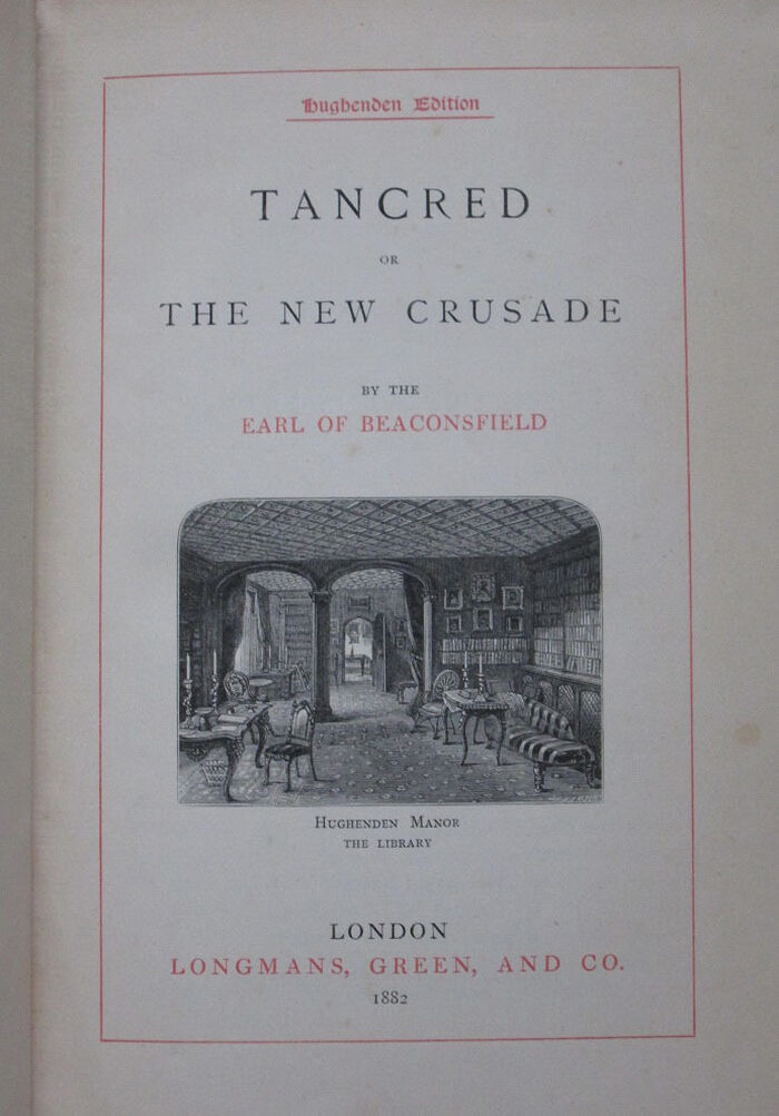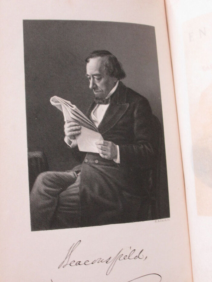 Hardback. 11 volumes, very attractively bound. Includes Venetia, Coningsby, Edymion, Lothair, The Young Duke and Count Alarcos, Vivian Grey, Tancred, Sybil, Henrietta Temple, Contarini Fleming and the Rise of Iskander, and Alroy. Light brown cloth with gilt and black titles and decorations to spines, and dark blue and gilt cartouche to the front with gilt and blue border, and further gilt boarder to the edges of the front board. Each page has a red border line around the text. Title pages each with a different engraving showing an aspect of Disraeli’s county house, Hughenden Manor, the lake, the terrace, the study, etc. Edward Buckton Lamb had done the remodelling of the house for Disraeli and his family.