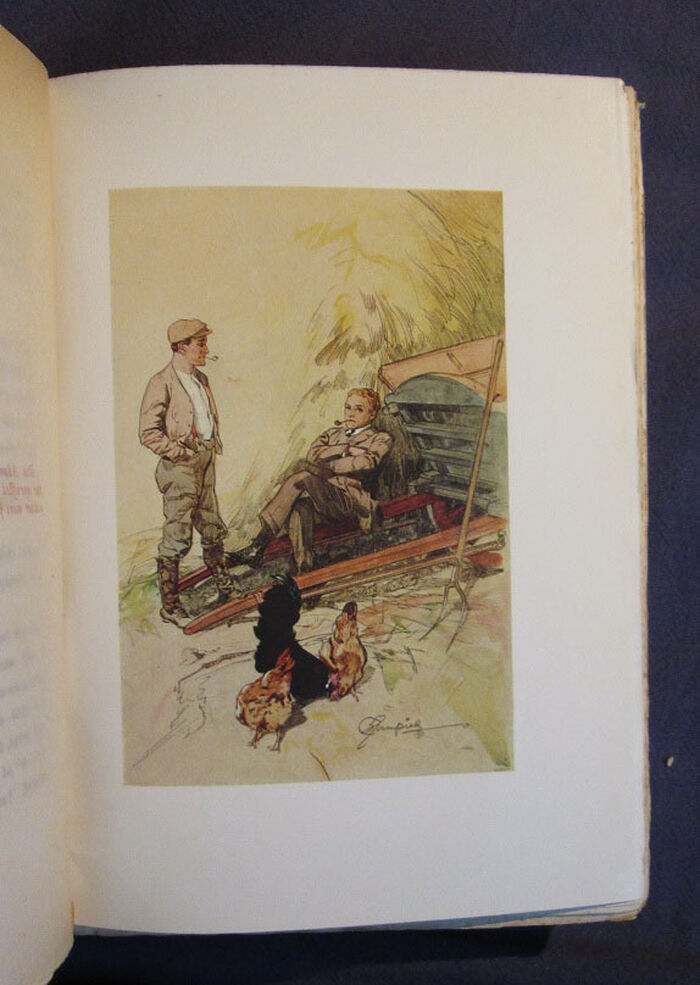 Hardback. 350pp. No date but the only books mentioned as also by Farnol are The Broad Highway and The Amateur Gentleman so presumed 1911 and a first edition. Illustrated by Edmund Blampied. Illustrated green cloth with blind impressed borders to front round a gilt bordered central colour illustrated panel in an art nouveau style and containing a colour illustrated paste-down. Gilt titles to spine with further colour illustration. Colour illustrated title page. Col. frontis and 21 further colour plates all with captioned paper guards. Colour illustration to title page. 235 by 135mm (9¼ by 5¼ inches). Pages uncut.