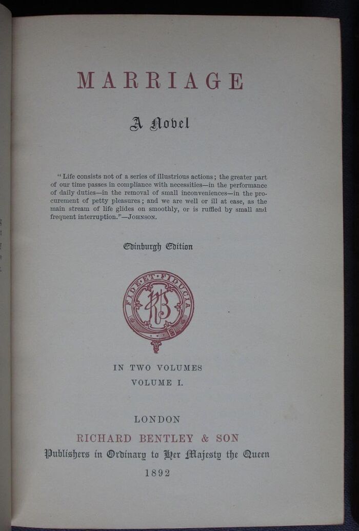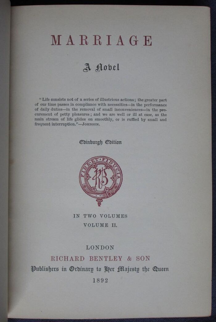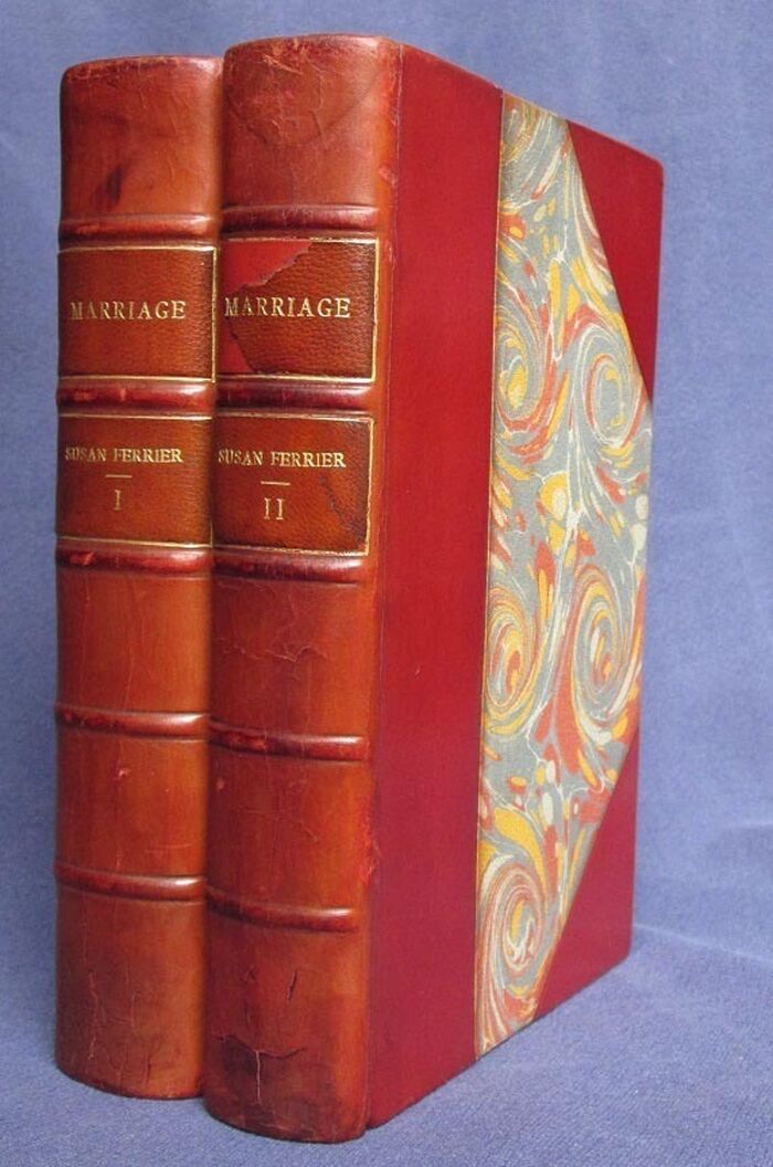 Hardback. 344pp+324pp. Novel. Half bound in red leather with red, blue and yellow marbled papers on boards and matching marbled endpapers. Raised bands to spines with two maroon leather labels and gilt titles to each volume. Gilt to top edge. Also includes substantial essay, 38pp., on Ferrier, and Ferrier’s Recollections of visits to Ashestiel and Abbotsford (home of Sir Walter Scott). A note on the text: “Miss Ferrier’s novels have, since their first appearance, suffered curtailment in all subsequent editions. The present edition is the first reprint since from the original editions, and contains the whole of the omissions in other reprints.” attributed to GB, New Burlington Street, presumably George Bentley son of the publishing founder, and subsequent partner.