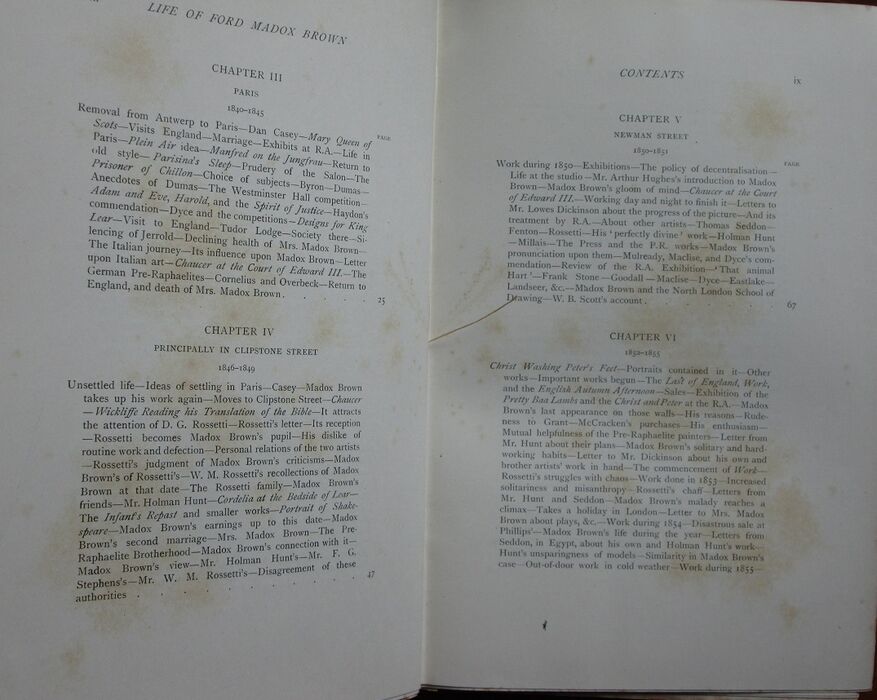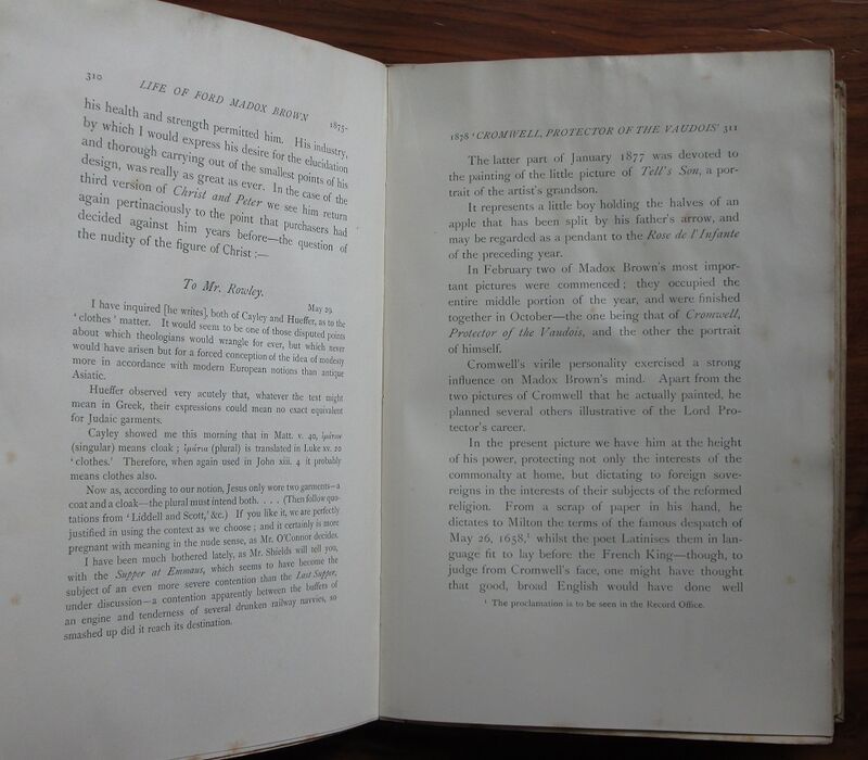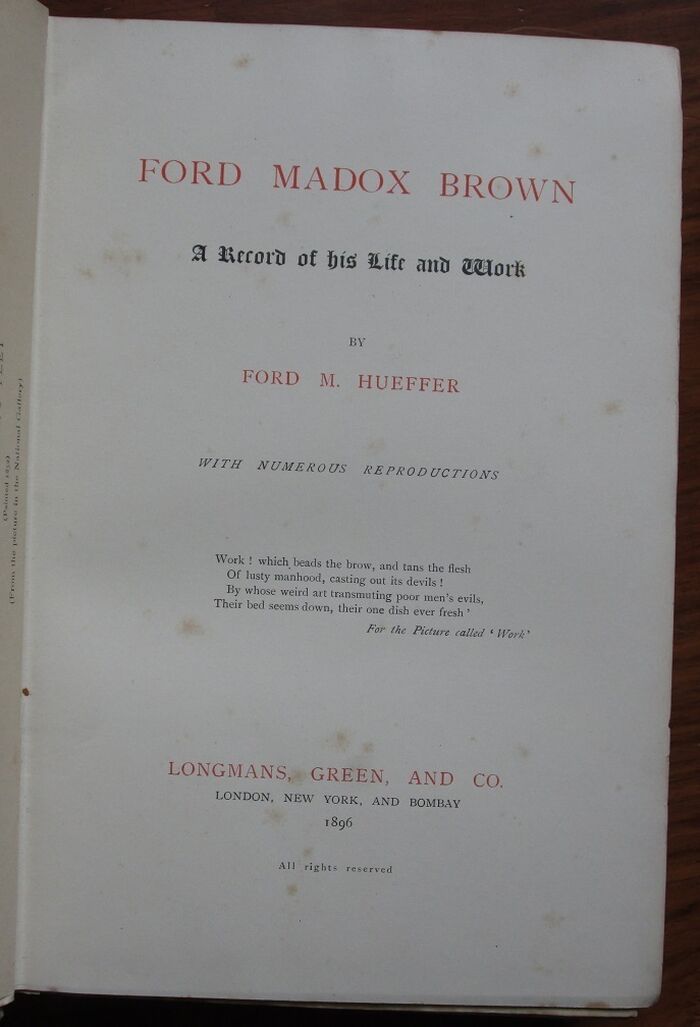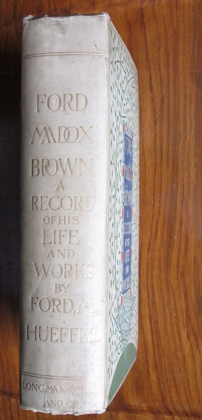 Hardback. First edition. Illustrated biography of the painter by his grandson the novelist better known as Ford Madox Ford. 'Ford Madox Brown was a Pre-Raphaelite painter of moral and historical subjects. His most famous paintings/works include Work, and The Manchester Murals (painted for Manchester Town Hall).' Cream cloth. Very pretty Victorian Arts and Crafts style binding colour illustrated to front by possibly by Walter Crane but more probably by William Harrison Cowlishaw [Arts and Crafts Book Covers by Malcolm Haslem, p.94] with tree and foliage design elaborately around a title panel in red, green, blue and gilt. gilt decorative titles to spine. 46 plates with tissue guards (printed with painting titles and possession details) and seven further integral illustrations.