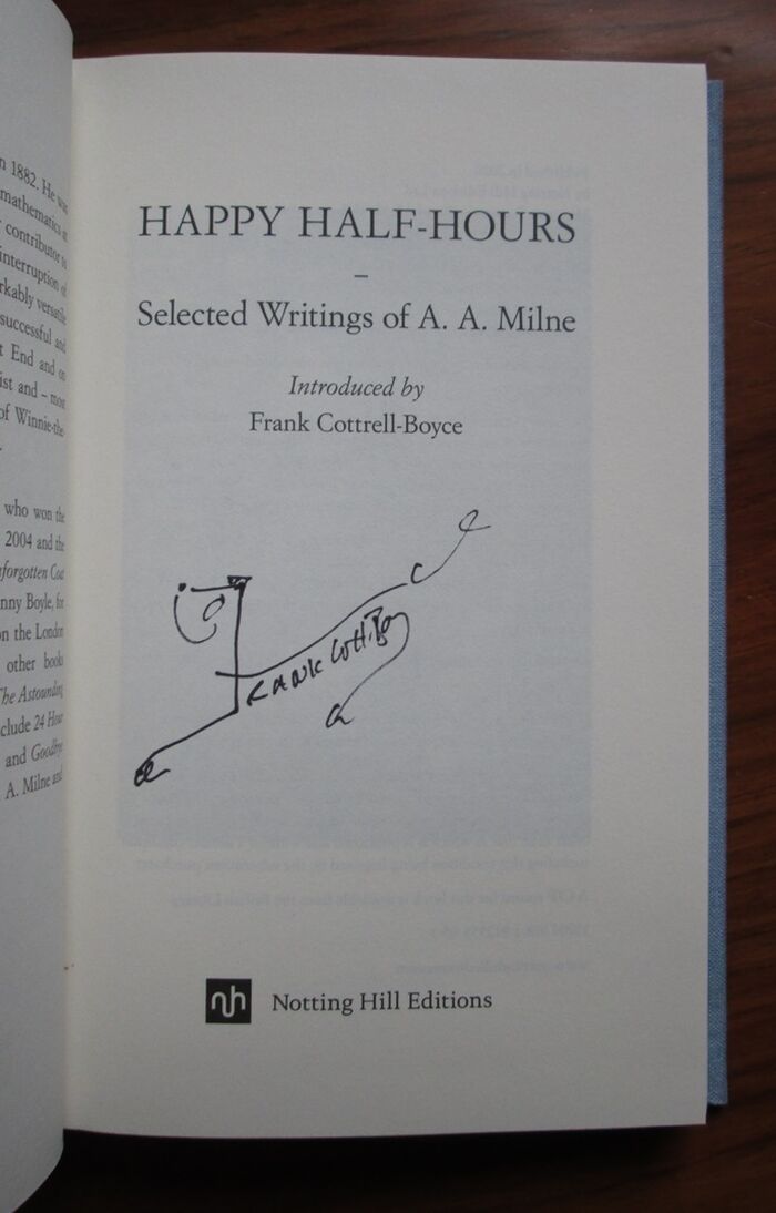 Hardback. Writings drawn from 40 years of Milne’s writing life on everything from marriage to golf to the atom bomb. Introduced by Frank Cottrell-Boyce. Signed by Frank Cottrell-Boyce to the title page. 163pp. Attractively bound in blue-grey cloth printed in cream and dark blue. Red ribbon bookmark.