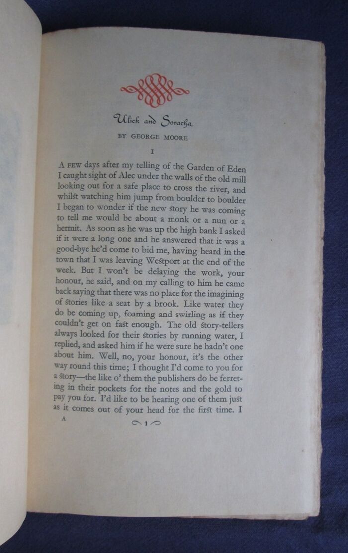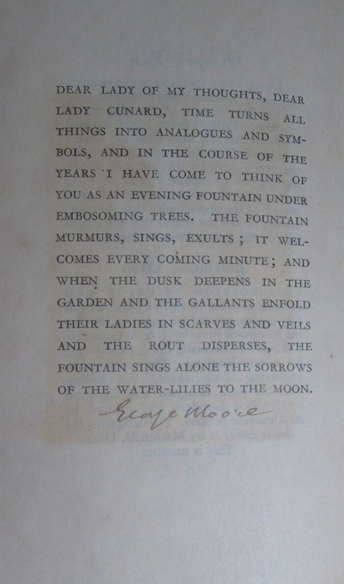 Hardback. 286pp. vi, 286pp. Signed limited edition, no. 162 of a limited edition of 1250 copies. Printed on Japon vellum with a loose cover also in Japon vellum printed in red with a design by Marion V. Dorn. Signed by George Moore under the dedication to Lady Cunard (Nancy Cunard) and facing a copper engraving by Stephen Gooden which reflects his description of Nancy Cunard. Marion Dorn is best known as a textile and carpet designed on the 1930s and 1940 whose work was very influential on taste at the time appearing in luxury London hotels and photographed for Vogue. Stephen Gooden was an engraver much associated with the Nonesuch Press and whose design of St George and the dragon on the bookplate for the Royal Library at Windsor Castle was used as the basis for the design of the reverse of the George Medal. Binding is cream buckram. Uncut edges.