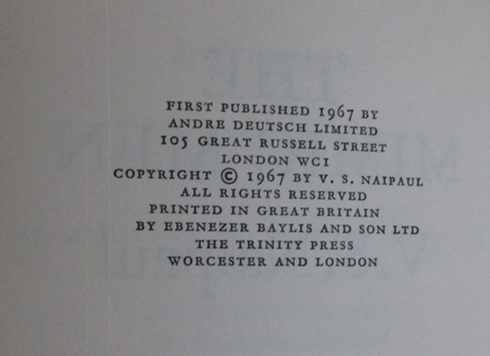 Hardback. First edition. 301pp. Novel. Dust jacket design by Salim Patel. V. S. Naipaul won the Nobel Prize for Literature in 2001.