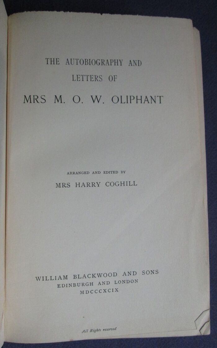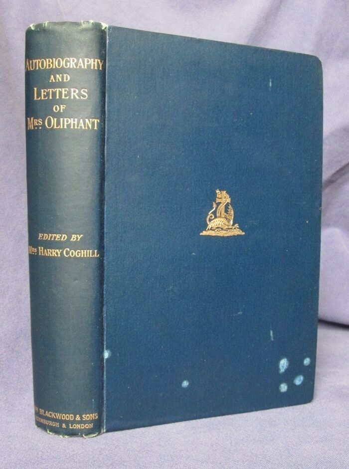 Hardback. xiv,451pp. Autobiography and letters of Margaret Oliphant (1828-1897) Frontis portrait from a drawing by Janet Mary Oliphant. One further plate showing a photograph of Margaret Oliphant with two of her sons and her nephew. The autobiography section, written in a lively style ends at p.150 meaning the bulk of the book is Margaret Oliphant’s letters. Includes a detailed list of Mrs Oliphant’s published works and a dated list of her contributions to Blackwood’s magazine. Arranged and edited by Mrs Harry Coghill who was born Annie Louisa Walker. She was a cousin of Margaret Oliphant and her companion/secretary/housekeeper as well as a writer in her own right. Bound in blue cloth with gilt titles to the spine and stamped with a gilt illustration of dragon to the front with a banner with the word Margaret. Margaret Oliphant was married to her cousin the stained glass designer Francis Wilson Oliphant.