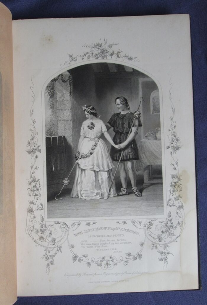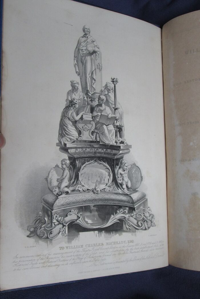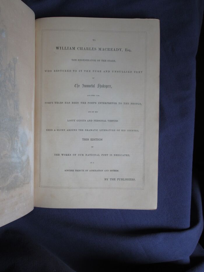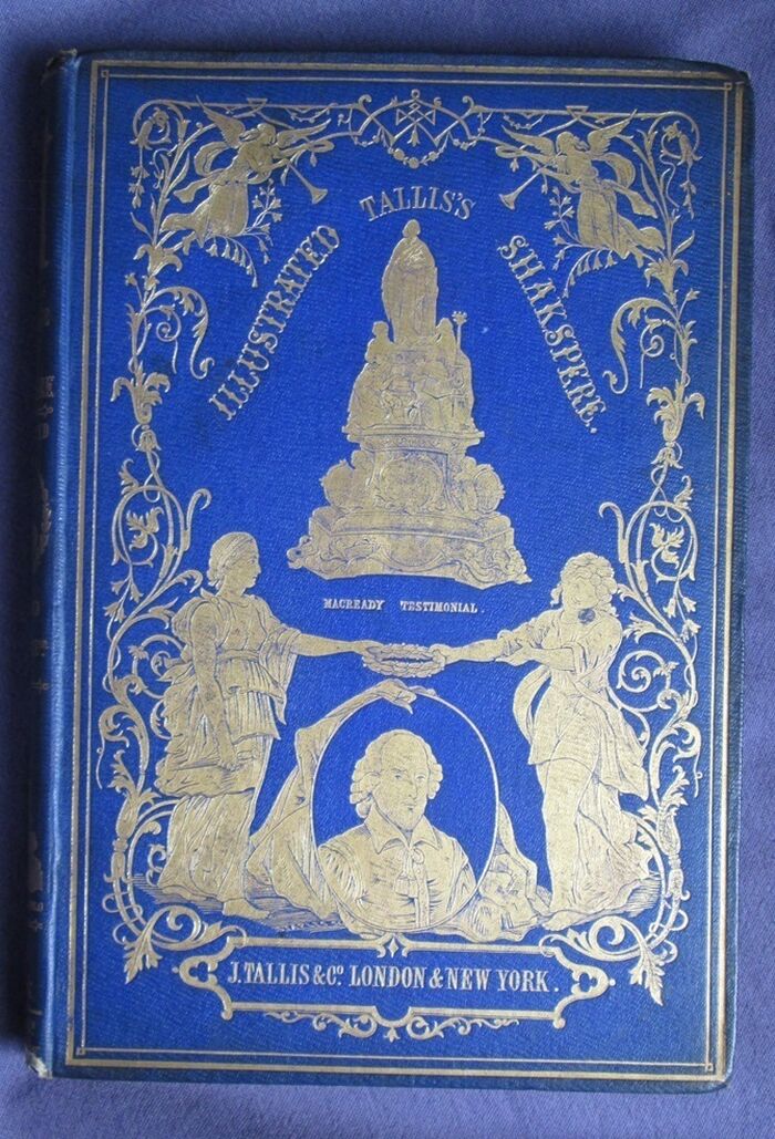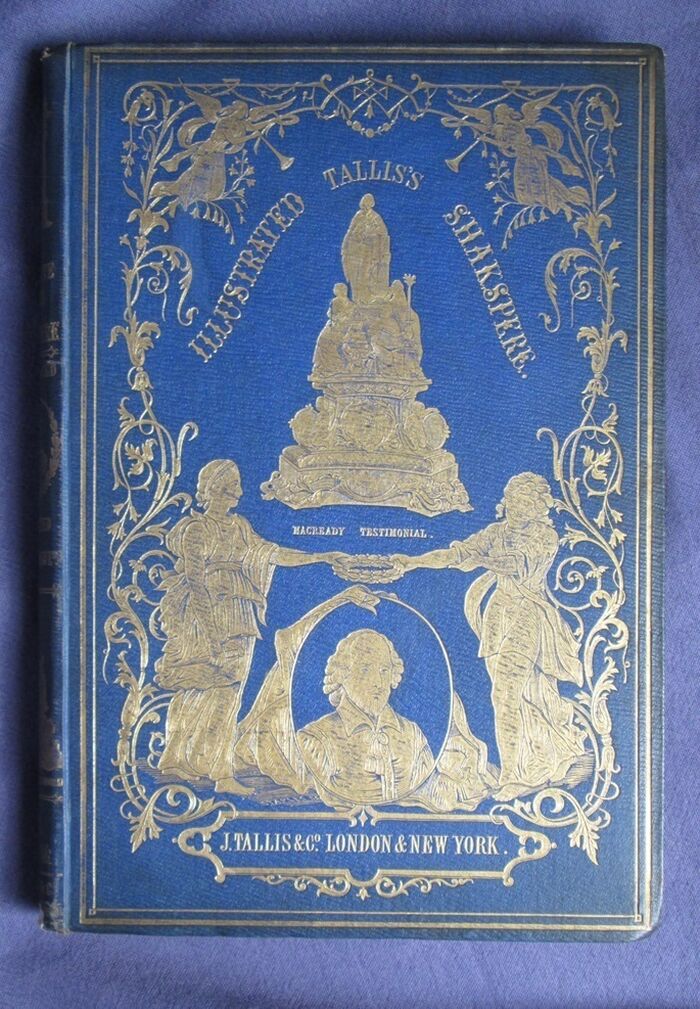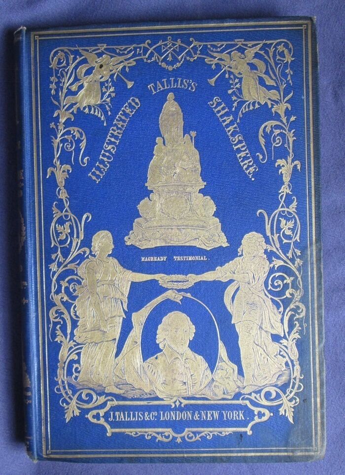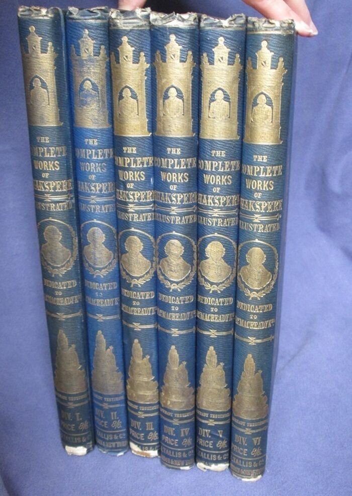 Hardback. The complete works of Shakespeare, illustrated in 6 volumes: 227, 496, 300, 576, 253, 487pp. Heavily decorated in gilt to front and spines. The set is dedicated by the publisher to the actor William Macready. The c 12 steel engravings with tissue guards to each volume mainly show William Macready in character as various members of the cast of Shakespearian characters. The illustrations also show a number of other prominent Victorian actors and actresses in character including Anna Mowatt and Isabella Glyn. Includes memoir of Macready. The set uses the popular Victorian spelling of Shakespeare’s name: Shakspere.