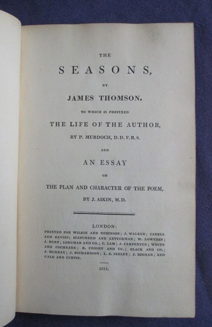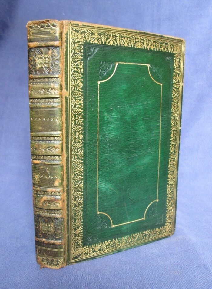 Hardback. lii,236pppp. In addition to the poem cycle there is a Life of the Author by P. Murdoch and an essay on the plan and character of the poem by J. Aikin, MD. Though read much less now, Thomson was popular and influential in his day, inspiring writers such as Ann Radcliffe with his descriptions of landscape and atmosphere. Green leather with detailed gilt decorations to both boards and spine. Raise bands to spine. Gilt dentelles. Gilt to all edges. Ex libris label and further early gift inscription (dated 1821).