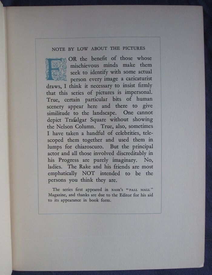 Hardback. 285 by 220mm (11¼ by 8¾ inches). 128pp. 12 double page colour paintings by David Low. Low was best known for his war time cartoons, and he was the originator of Colonel Blimp. Blue cloth with gilt titles to spine. Patterned papers to boards.