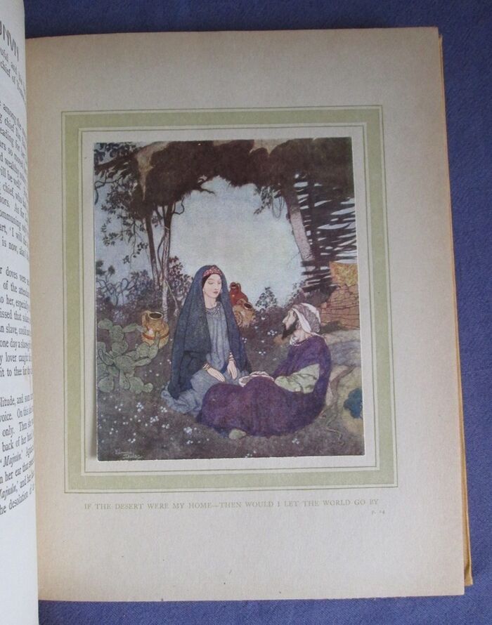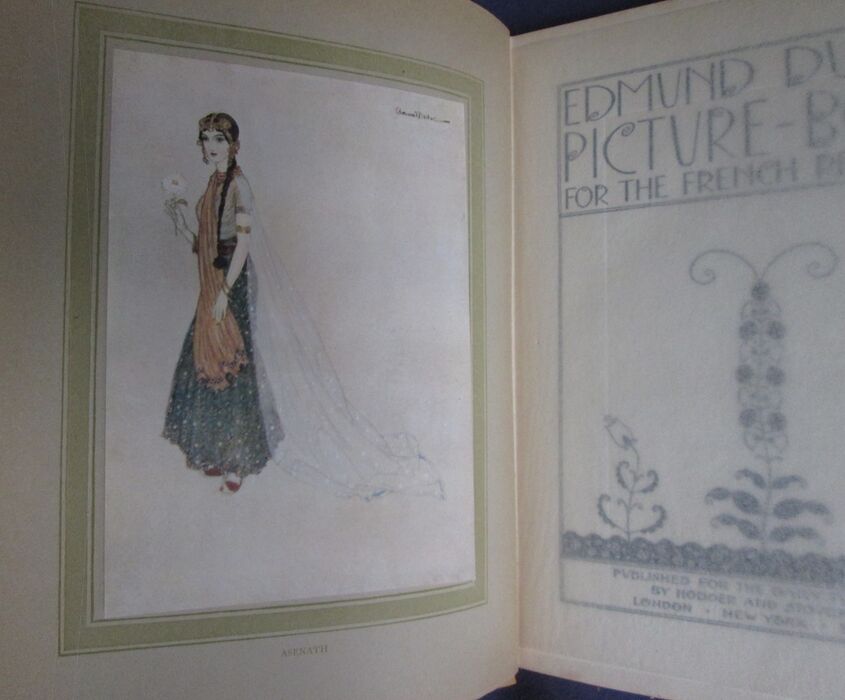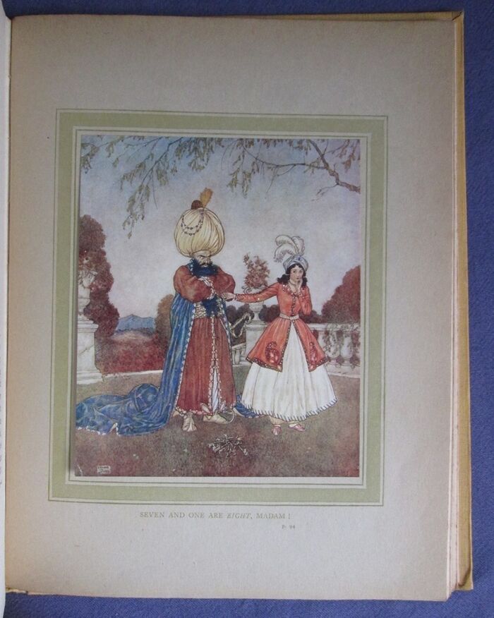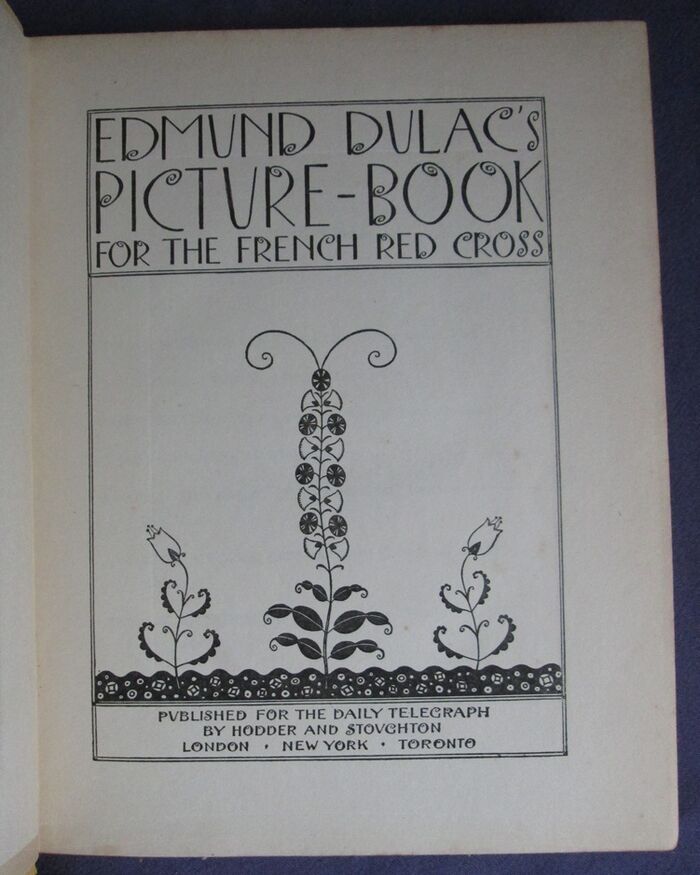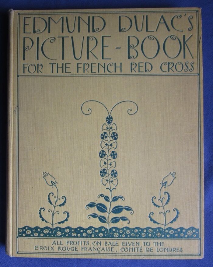 Hardback. 135pp. 20 beautiful colour plates mounted with printed border lines and titles. Yellow cloth illustrated in green. Produced to support the French Red Cross in the first world war. 275 by 210mm (10¾ by 8¼ inches). Stories include The Princess and the Pea, Cinderella, Blue Beard, Sinbad, Cerberus, as well as French songs (in translation) and stories from Persia and China. Includes a page describing the Daily Telegraph’s appeal on behalf of the Red Cross.