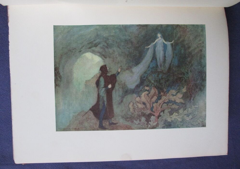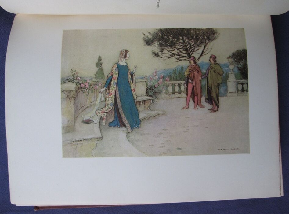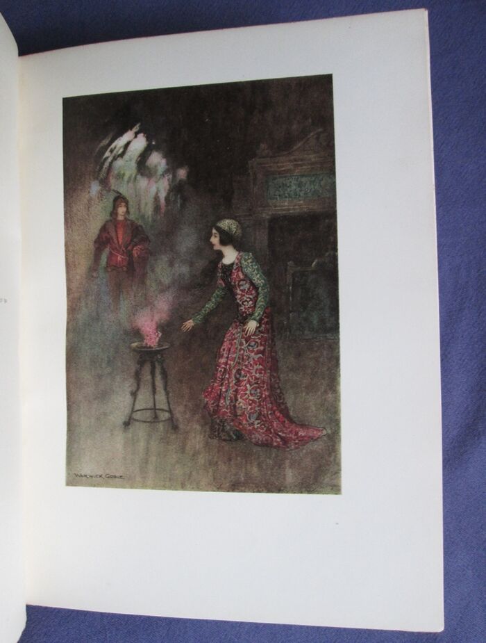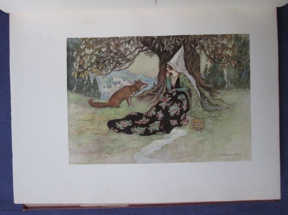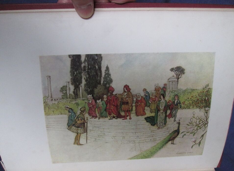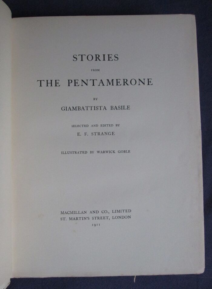 Hardback. Fairy tales beautifully illustrated by Warwick Goble. These tales collected by the Neapolitan Giambattista Basile contain the first European version of Cinderella and Razpunzel, though the later versions by Charles Perrault and the Brothers Grimm respectively are better know. In this collection these two tales are called La gatta Cenerentola and Petrosinella. Colour frontis and 31 further colour plates all with guards with the picture titles printed. Selected and edited by E. F. Strange. Red boards with gilt illustration to the upper board and gilt titles to the spine. 255 by 200mm (10 by 7¾ inches).