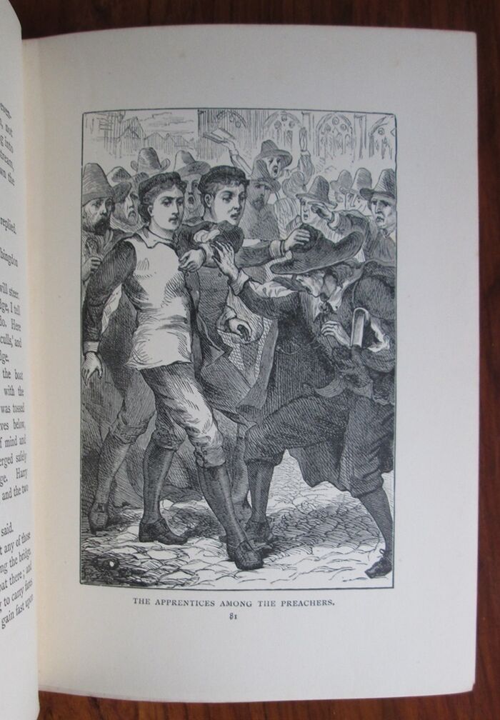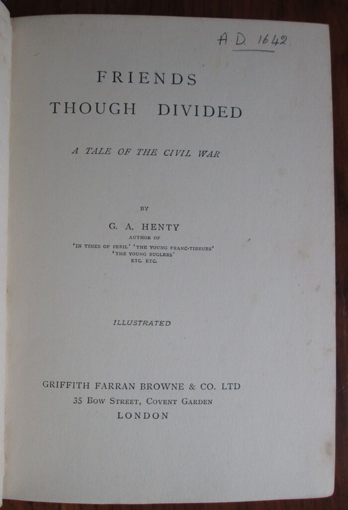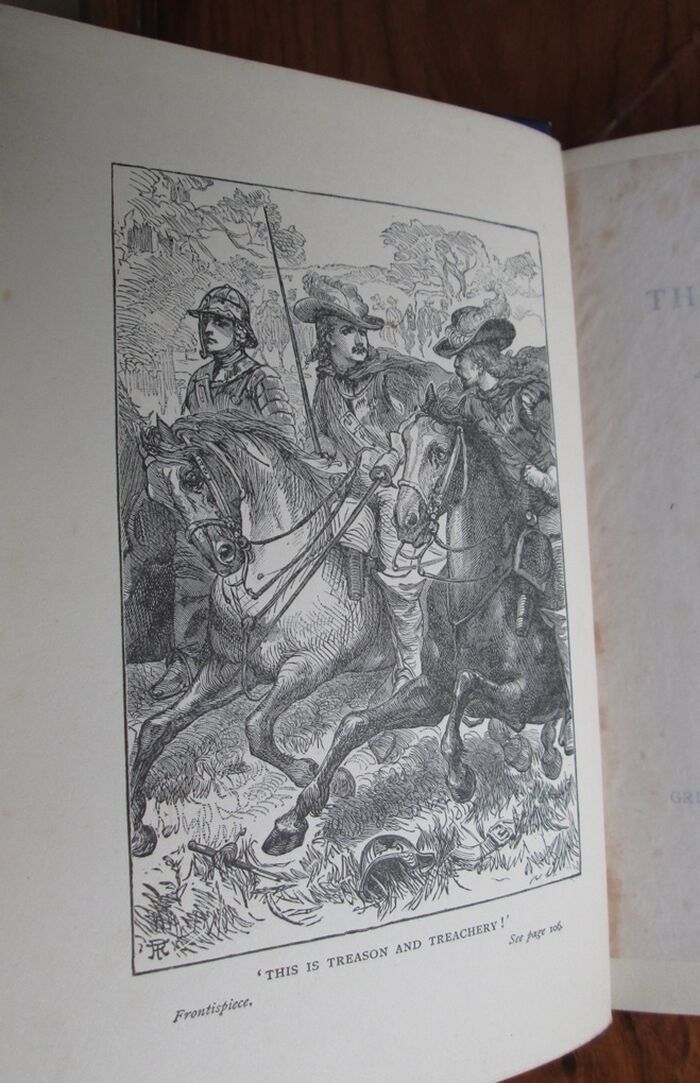 Hardback. 384pp. Children’s book set in the English Civil War. No date but previous owner’s gift inscription dated 1904. Bound in blue cloth, illustrated in gilt to front and spine. Black and white plates.
