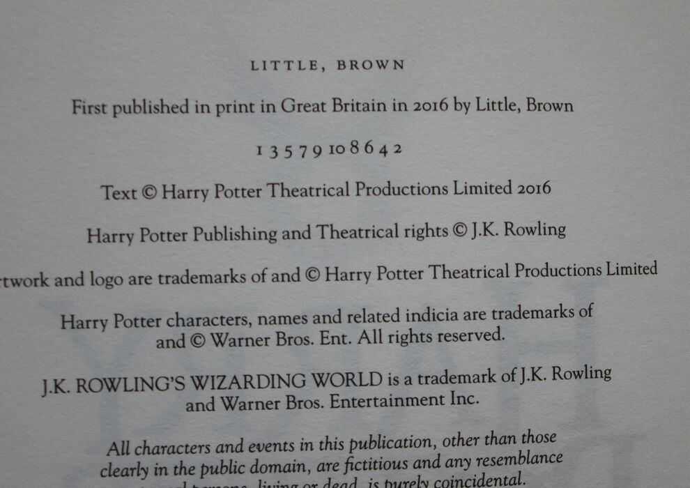 Hardback. 337pp. First edition, first printing with complete number line. The story, the eighth in the Harry Potter series, was performed as a two-part play written by multiple BAFTA award winning Jack Thorne and directed by Jack Tiffany. Complete list of cast and creatives to back. Illustrated endpapers.