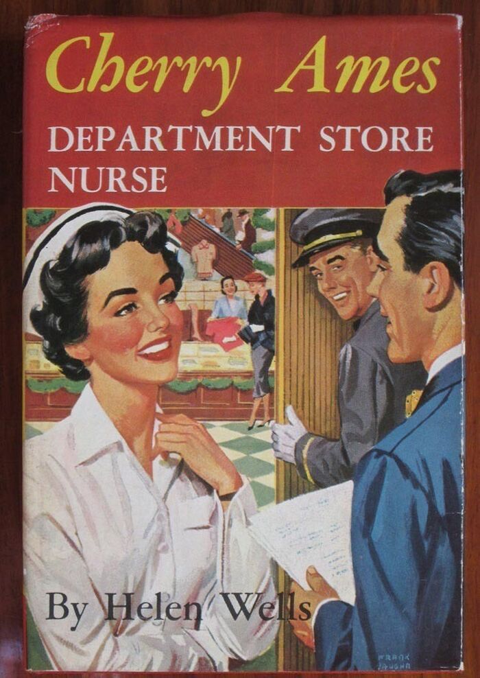 Hardback, 184pp. Second impression. The fourteenth book in the Nursing stories series. Black and white frontis. Red boards with black titles to spine and a small black illustration of Cherry to front. Colour illustrated dust wrapper by Frank Vaughn shows Cherry in her white uniform talking to two male members of staff with the department store visible behind them.