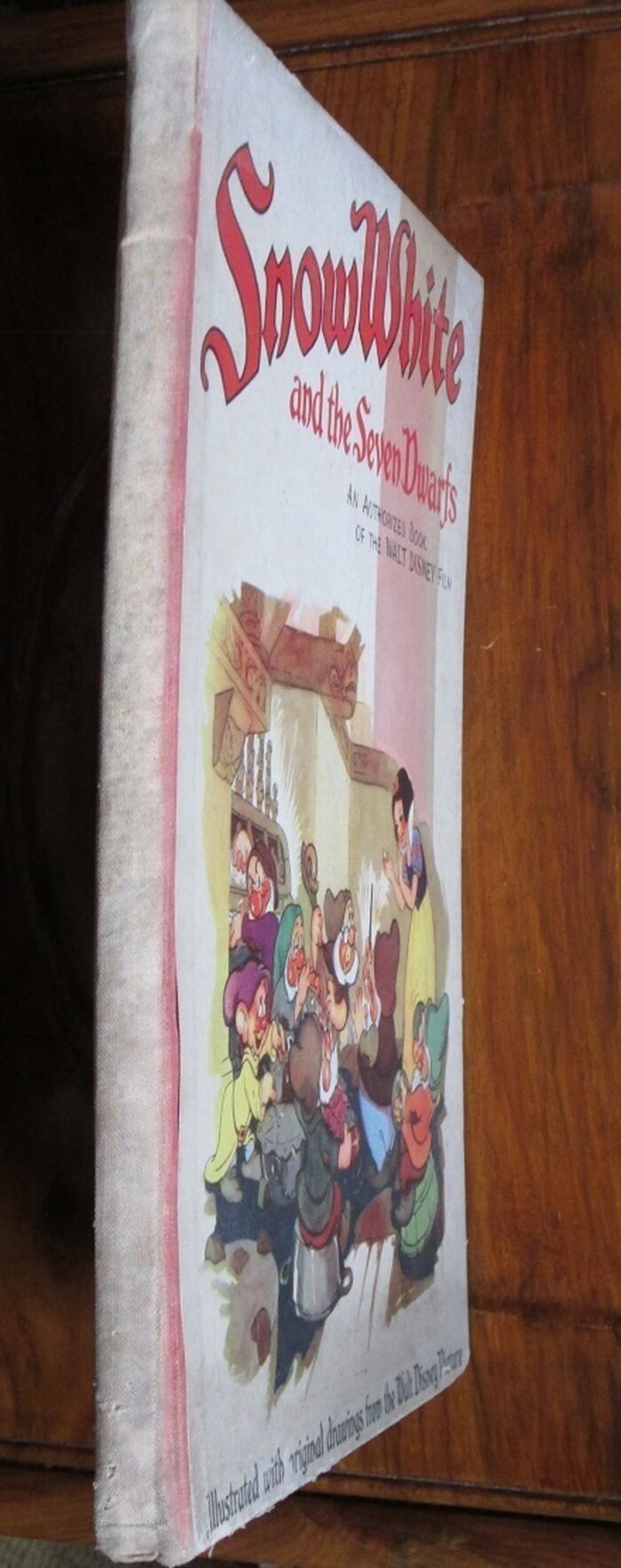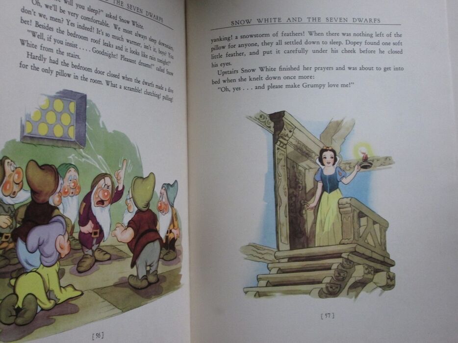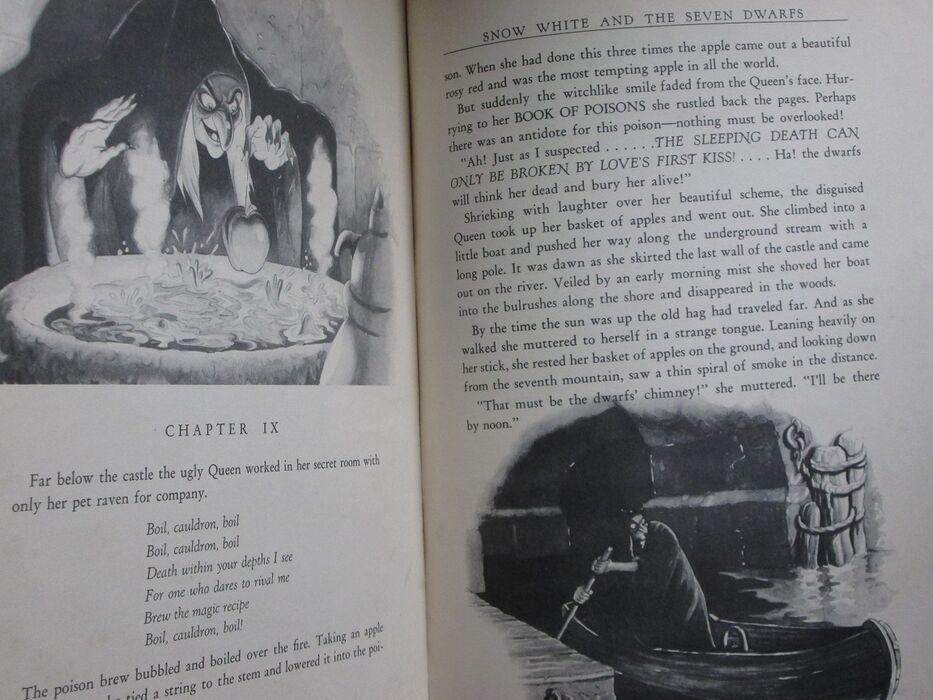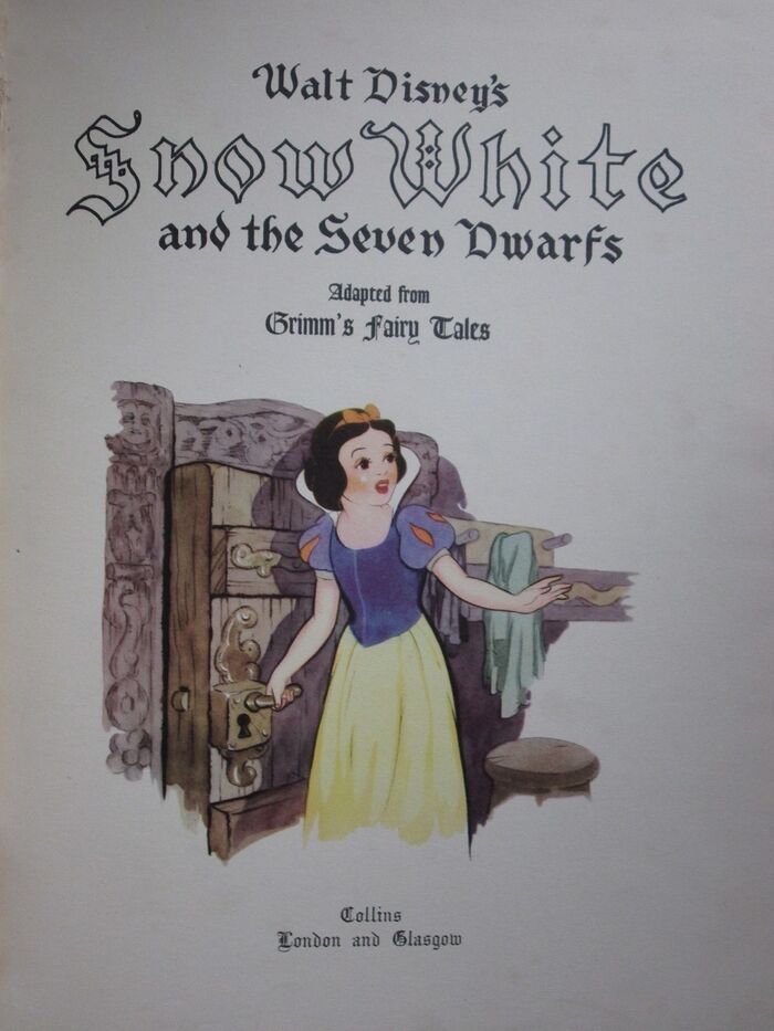 Hardback. Adapted from Grimm's fairy tales with original drawings from the Walt Disney picture. Undated, c. 1938. Gift inscription to prelim. Illustrated throughout. Mainly in black and white but with some colour. Illustrated endpapers in sepia tones. Colour illustrated title page. Red cloth to spine. Colour illustrated papers to upper boards and plain red paper to rear board. LArge format: 320 by 245mm (12½ by 9¾ inches).