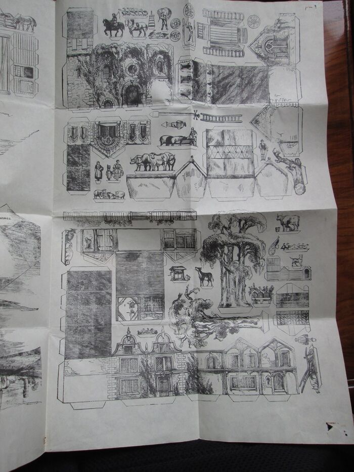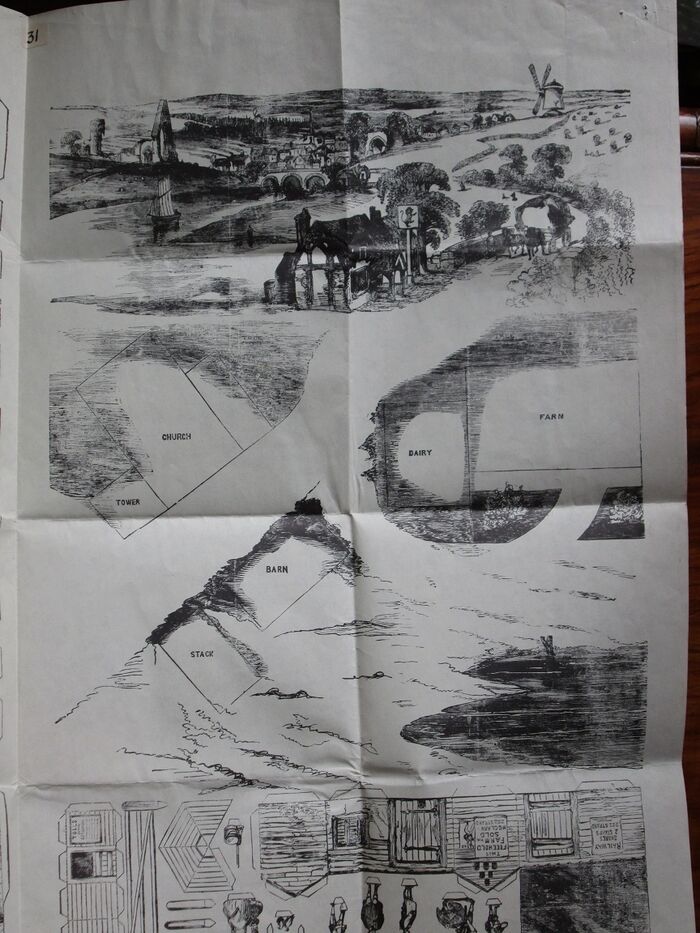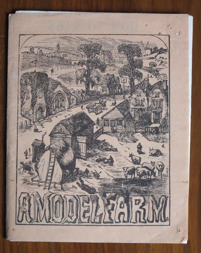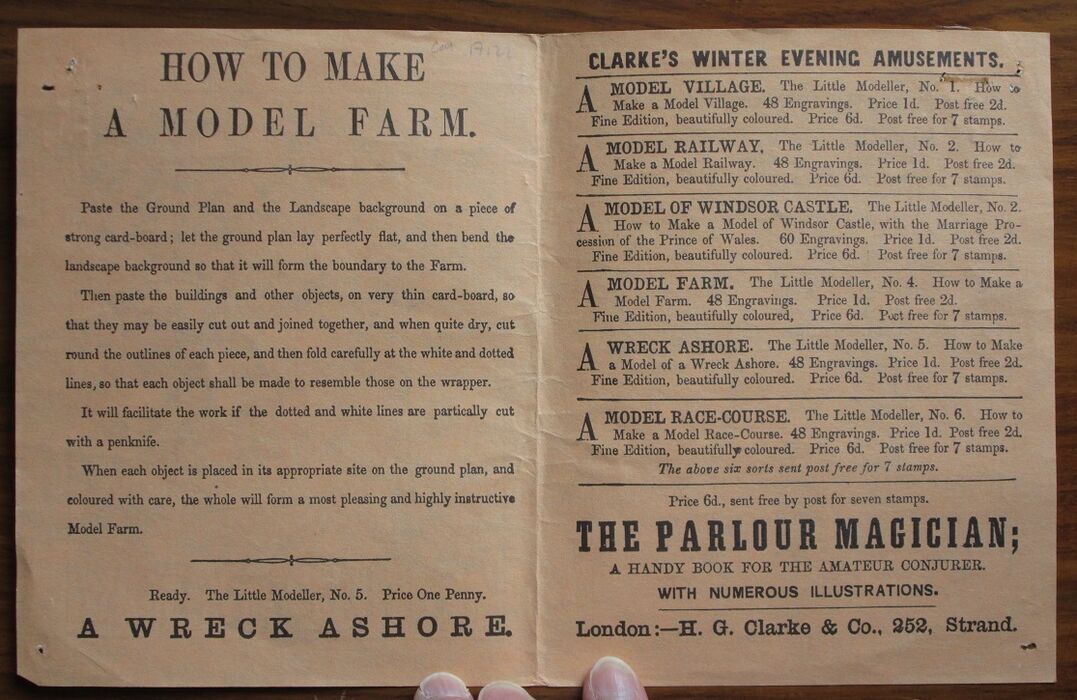 Paper toy. Large sheet illustrated in black and white with farm for cutting out, folded within, and previously attached by staples, to paper cover with instructions and publisher’s ads. No date, presumed late nineteenth, early twentieth century.