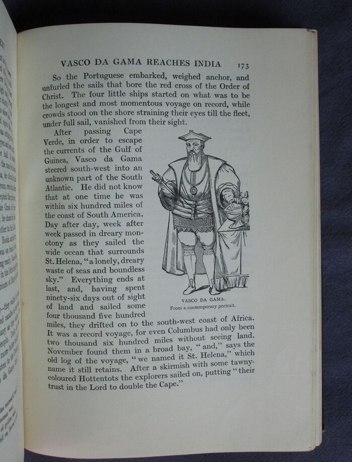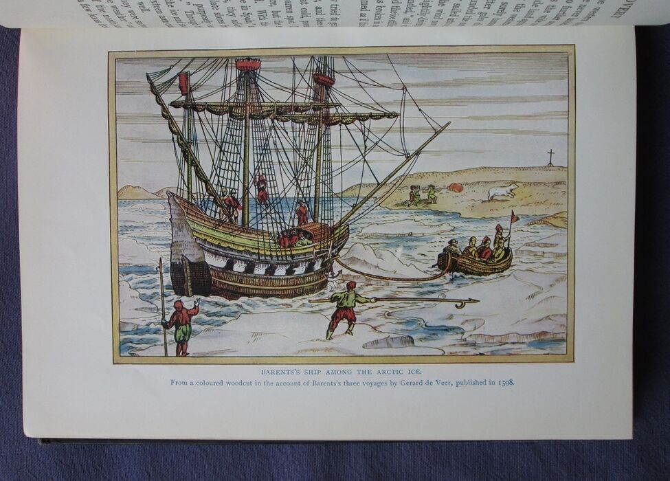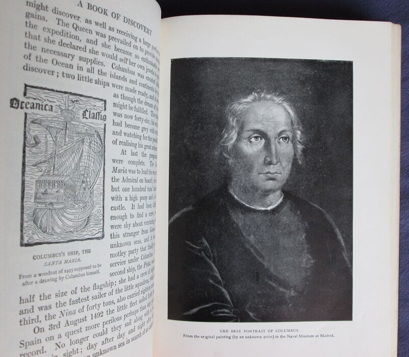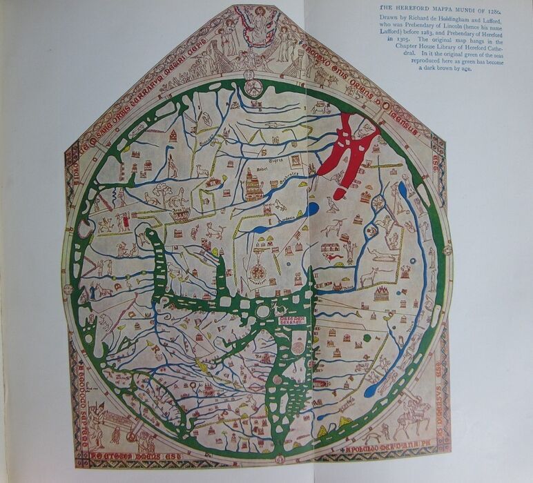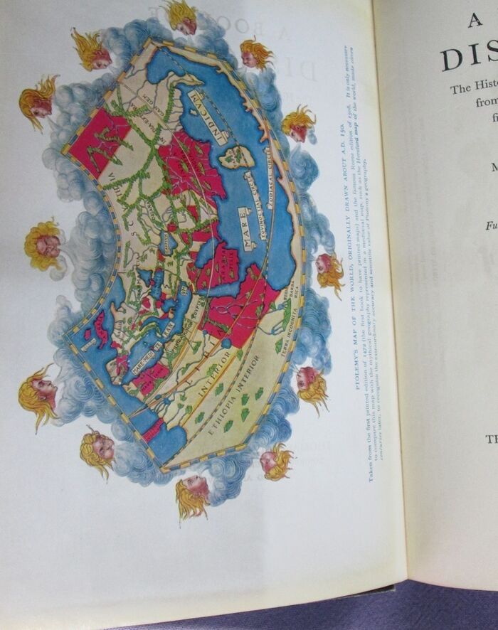 Hardback. No date but with gift inscription dated 1958. Dark green cloth with gilt titles and gilt decorations including a sailing ship to the spine and highly decorative shaped gilt border including and anchor surround a colour illustrated paste down of Ptolomy’s map of the world. xiii,554pp. Colour frontis and 8 further colour plates including a foldout colour reproduction of the Mappa Mundi of Hereford and a double spread of Pierre Desceliers Map of the World of 1546. 16 Black and white plates. Additional integral black and white illustrations throughout.