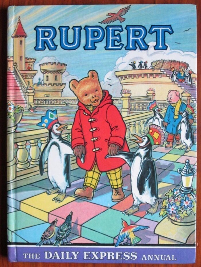 Hardback. Rupert Bear annual. Illustrated by Alex Cubie. Rupert in red duffle coat walking hand in hand with two penguins to the front.