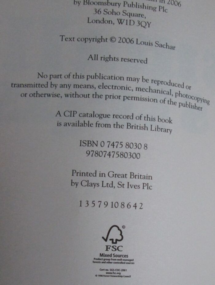 Hardback. 259pp. First UK edition. Young adult novel, spin-off from Louis Sachar’s prize winning Holes. Colour illustrated matt boards with matching dust jacket.