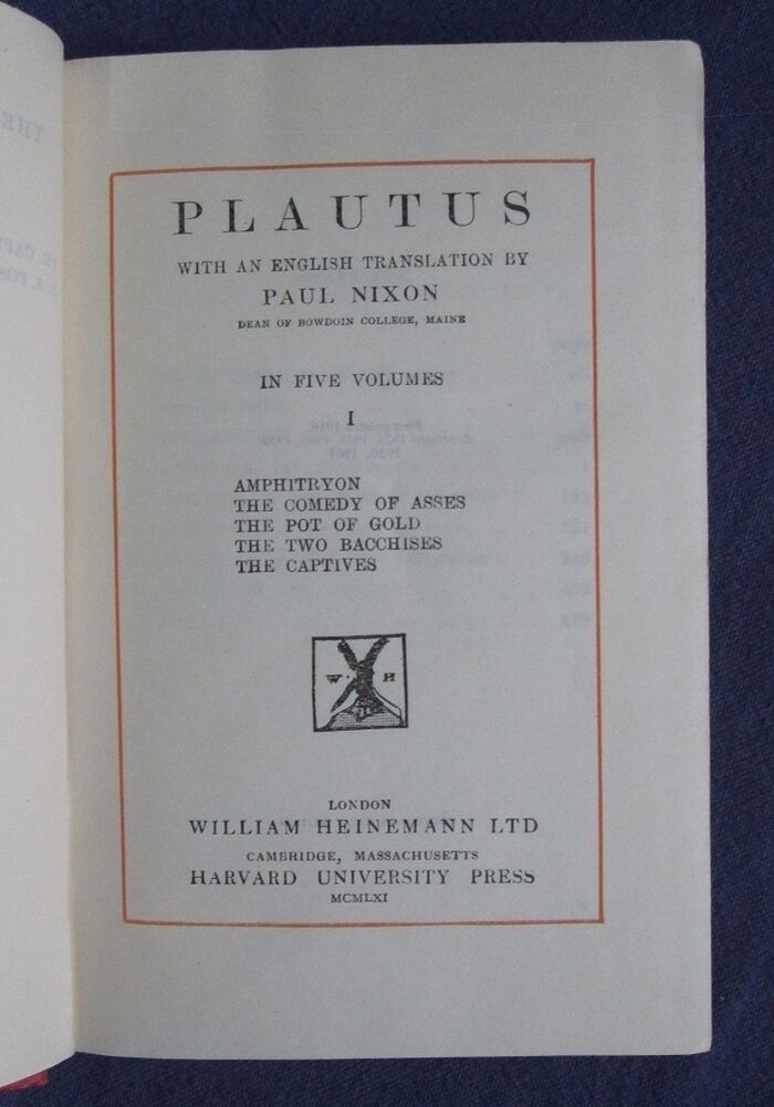 Hardback. xix,570pp. Volume one only containing Amphitryon, The Comedy of Asses, The Pot of Gold, The Two Bacchises, The Captives. Plays in original Latin with an English translation of each play by Paul Nixon, presented en face. Loeb Classical Library series.