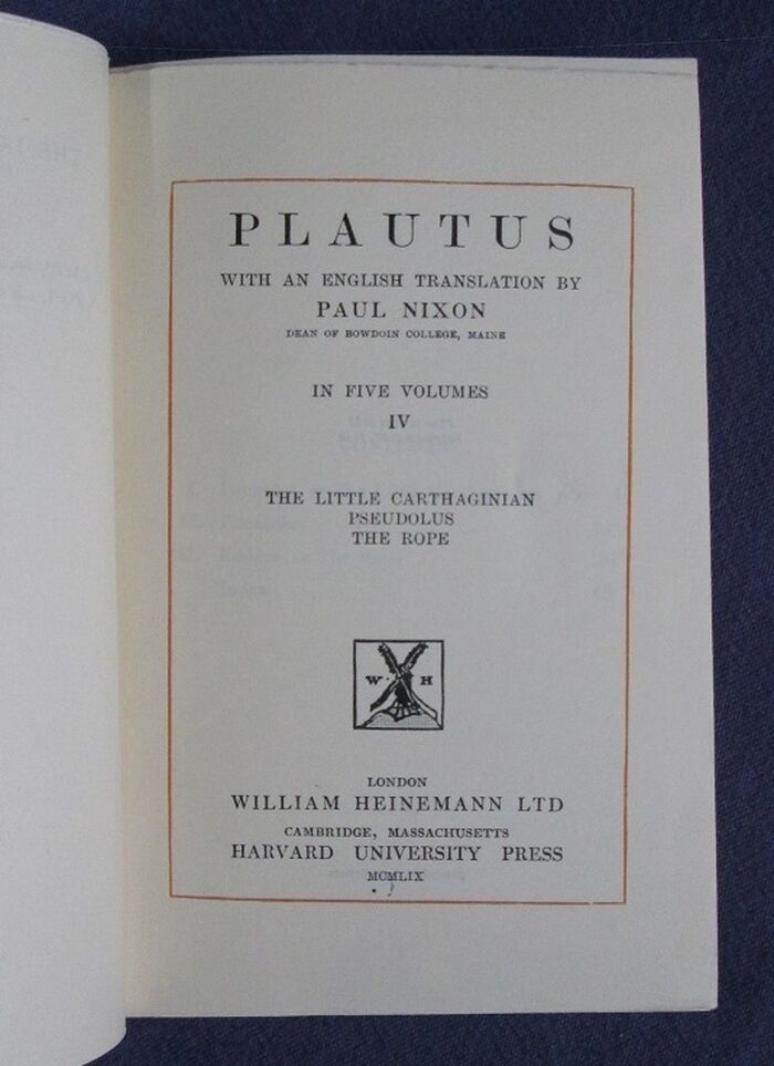 Hardback.434pp. Volume four only containing The Little Carthaginian, Pseudolus, The Rope. Plays in original Latin with an English translation of each play by Paul Nixon, presented en face. Loeb Classical Library series.