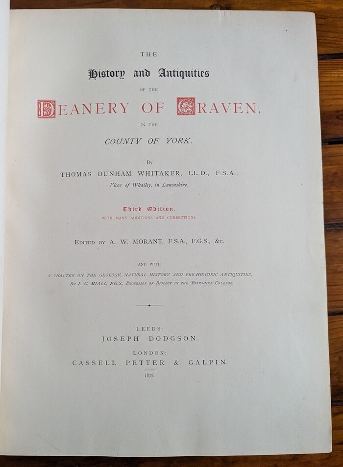 Hardback. Original, tan half Morrocco binding with raised bands and gilt lettering. This is the more extensive third edition of this detailed and important history of Craven in Yorkshire, containing around 90 additional pages of texts plus additional plates including ones of Skipton Castle, Sawley Abbey and Kirkstall Abbey. Craven encompasses parts of Airedale, Wharfedale and Ribblesdale including the towns of Skipton, Settle, Slaidburn, Bingley, Keighley, Ilkley as well as settlements such as Gargrave, Mitton and Burnsall. Edited by Alfred William Whitehead Morant and with a chapter on the 'Geology, Natural History and Pre-Historic Antiquities' by Louis Compton Miall, Professor of biology in the Yorkshire College (now University of Leeds). xxii, a further 6 unpaginated leaves showing contents and addenda, 655pp. Binding instructions to last page. Plates, some maps / plans, 29 detailed pedigrees plus additional within text illustrations. Marbled endpapers with reinforced gutter.