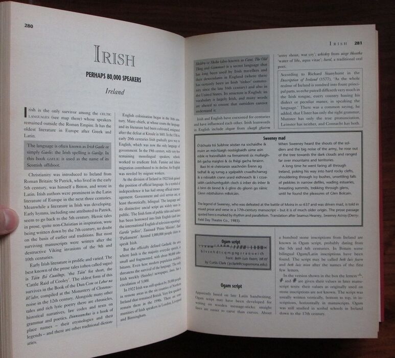 Hardback. Second impression. xvi, 734pp. Detailed diction giving ample space of at least a page to each entry which comprises a mix of historical information, maps, examples, alphabets, etc. an A-Z reference from Abkhaz and Abaza to Zulu. Glossary and index.