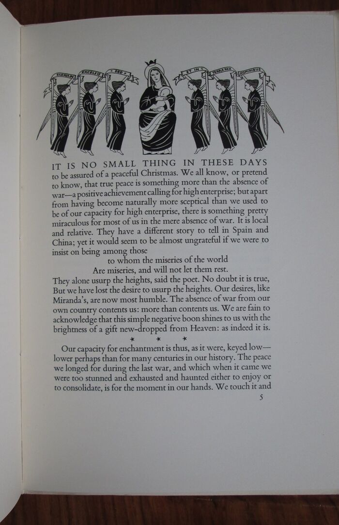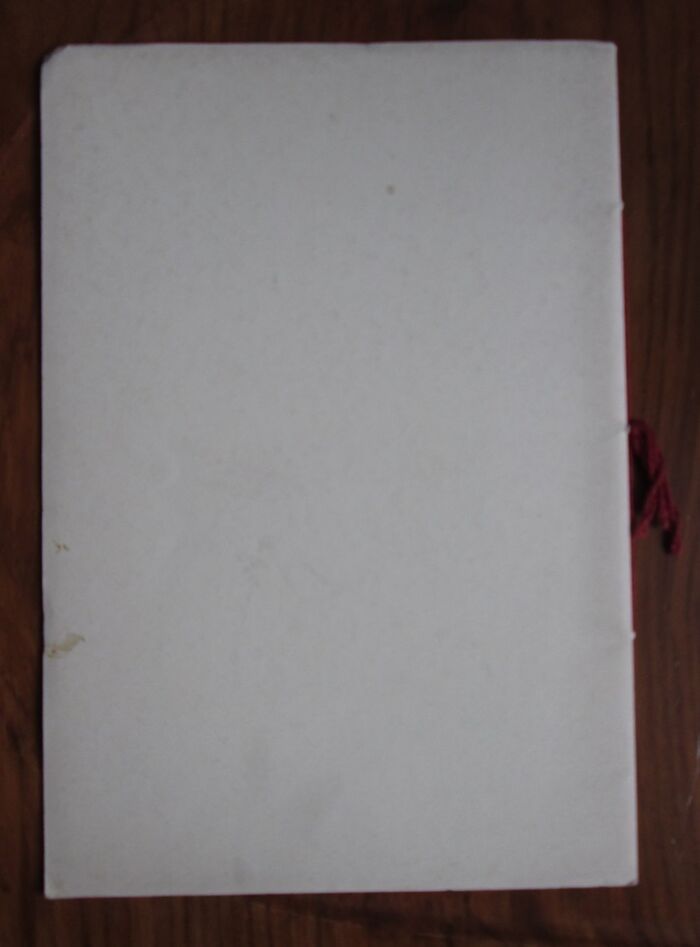Sewn pamphlet binding with red cord tied in a bow. Over-sized card wraps. Printed on cream paper under the direction of Leonard Jay. Line block to header drawn by R. Cashnella, a detail of which is reproduced on the front in red. Red and black title to front.
