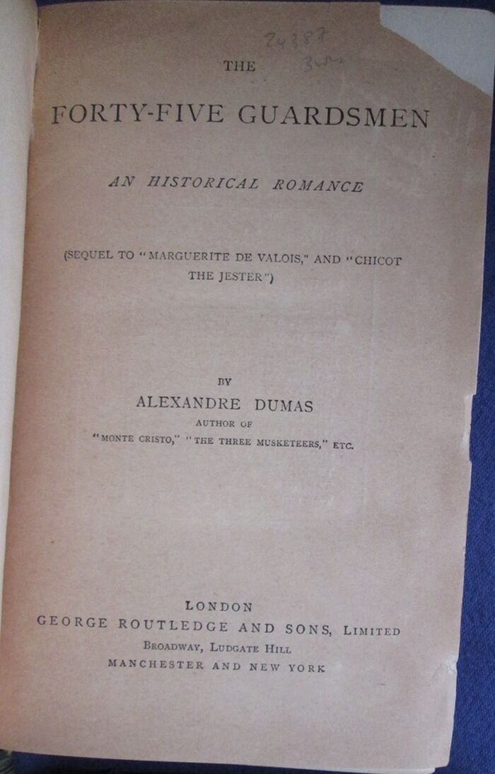 Notes These three volumes match decoratively but have aged slightly differently: Marguerite de Valois is slightly brighter and the other two volumes also have a little more rubbing to the edges. Slightly bumped to points. Boards have faint marks and small spots of discolouration. All three are softening with some slight creasing to spine ends but The Forty-Five Guardsmen has greater spine end wear including some nicks and tiny tears and a 1cm long horizontal slash neat the head of the spine and it also has some tape to front internal hinge. Some slight age toning to pages more pronounced to prelims. Marguerite has a line dark stain to the back but the books are otherwise clean and sound.