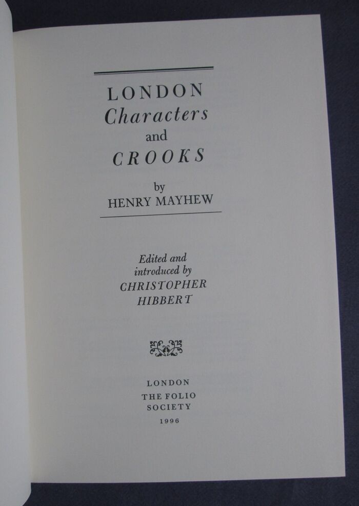 Hardback. xvii,535pp. A substantial selection of 'characters and crooks' drawn from Mayhew's London Labour and the London Poor and from Mayhew’s London edited by Peter Quennell. 20 illustrations. Olive green cloth decorated in black and gilt with a design by David Eccles. Black slipcase.