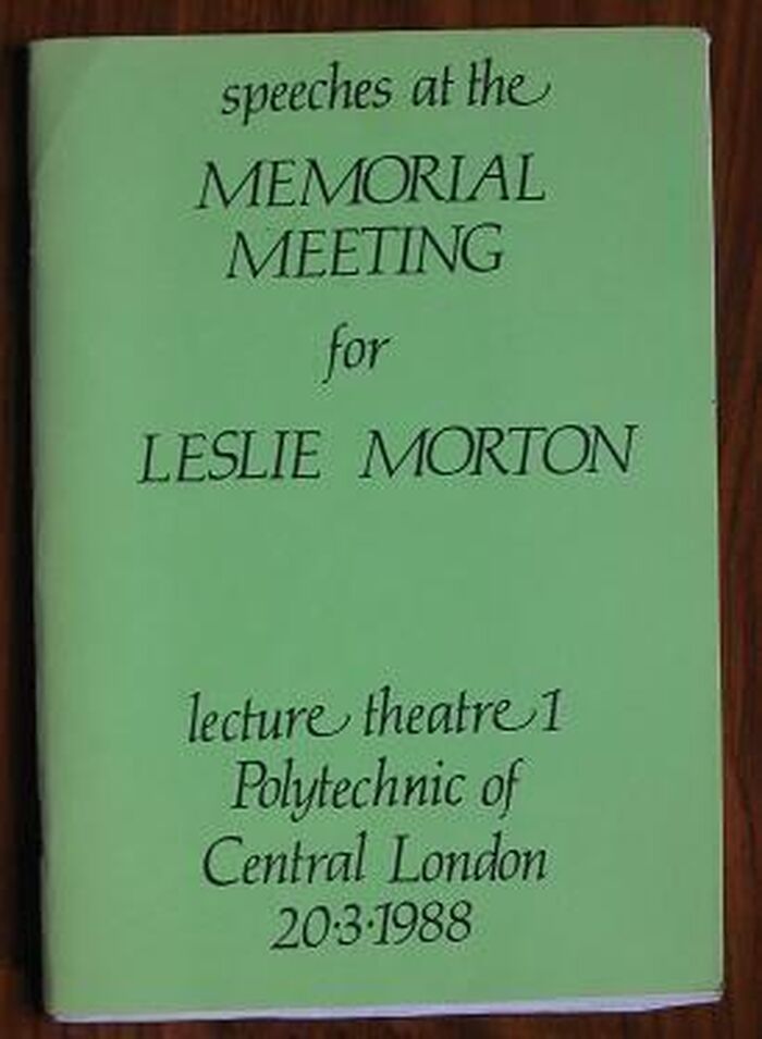 Pamphlet. 51pp. Very basic quality reproduction of the text of the speeches given at the Memorial Meeting for the Marxist historian A. L. Morton held at the Polytechnic of Central London, in stapled card binding. Speakers included Christopher Hill, Eric Hobsbawm, etc.