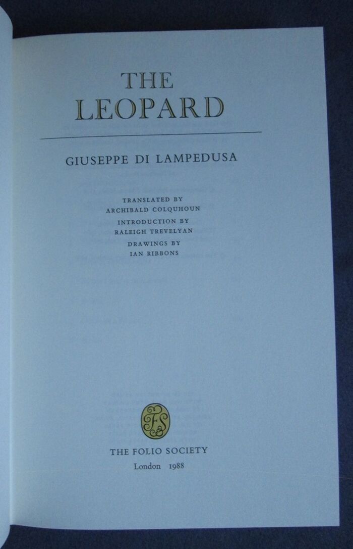 Hardback. Novel by the Sicilian writer and aristocrat, Giuseppe Tomasi di Lampedusa, and forst published posthumously in 1958. Translated by Archibald Colquhoun. Introduction by Raleigh Trevelyan. Drawings by Ian Ribbons. 10 two tone illustrations, two of which are double page. xix,186pp. Maroon cloth with gilt and black titles to spine. Italian papers to the boards. Beige slipcase.