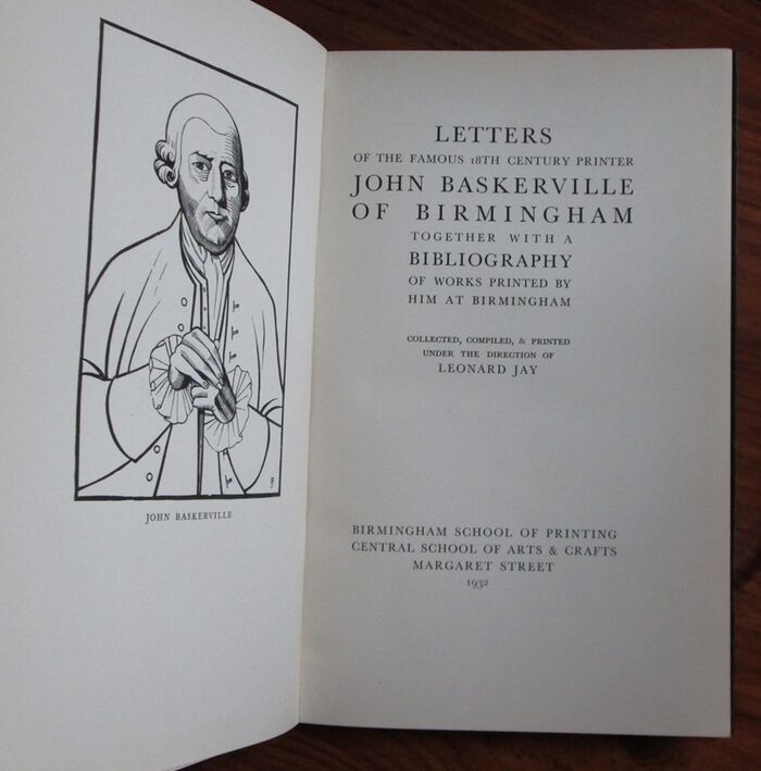 Hardback. Collected, compiled and printed under the direction of Leonard Jay. 55pp. 275 by 180mm (10¾ by 7 inches). Frontis woodcut portrait. 15 letters included here to/from the likes of Robert Dodsley partner in R & J. Dodsley publishers, and the writer and MP Horace Walpole, the Rev Doctor Caryll, VC of the University of Cambridge, Voltaire and Benjamin Franklin. These discussions of paper, ink, moulds and type and lettering give an insight into both the brook and printing trades in the 19th century. The woodcut portrait is by E. Joyce Francis who was at the Birmingham School of Arts and Crafts in the 1920s and 1930s and did several pieces of work for the Birmingham School of Printing.