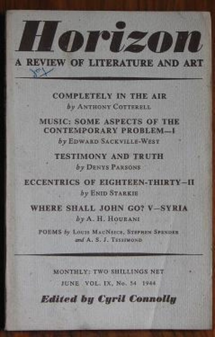 Cyril Connolly's influential Horizon. Contributions includes Completely in the Air by Anthony Cotterell, Music - Some Aspects of the Contemporary Problem I by Edward Sackville-West, Testimony and Truth by Denys Parsons, Eccentrics of Eighteen-Thirty II by Enid Starkie, Where Shall John Go? V - Syria by A. H. Hourani. Poems by Louis MacNeice, Stephen Spender and ASJ Tessimond.