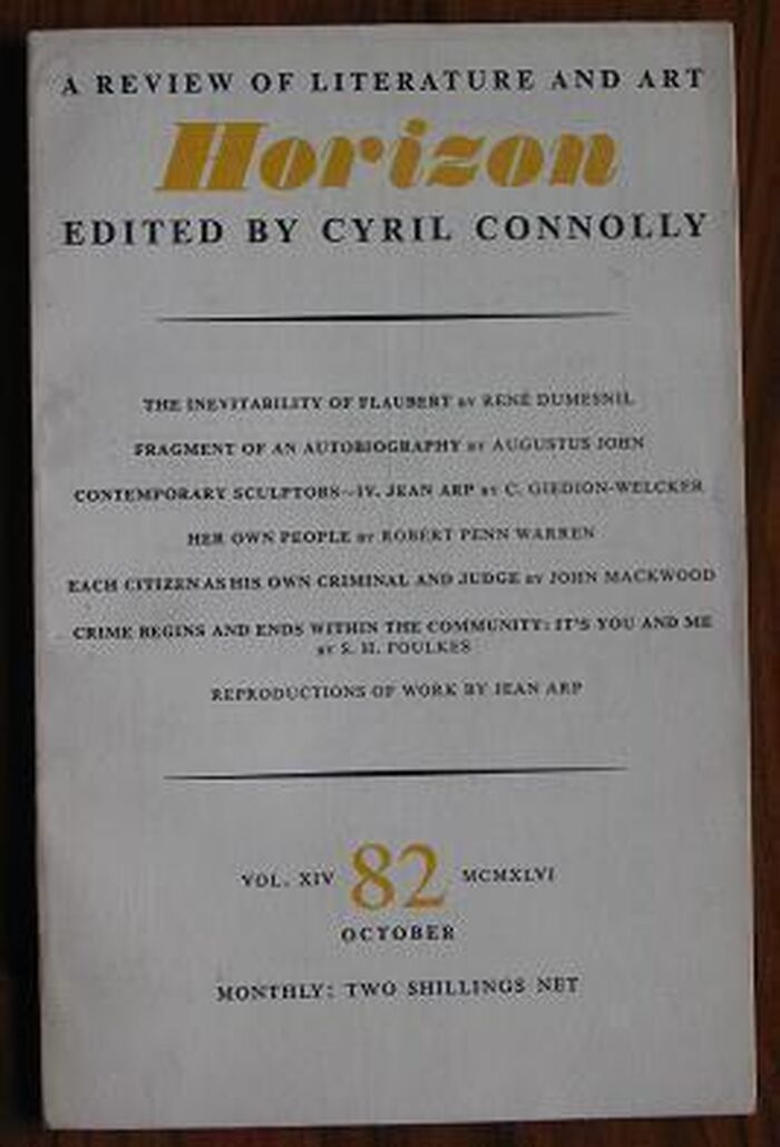 Cyril Connolly's influential Horizon. Contributions include: 'The Inevitability of Flaubert' by René Dumesnil, 'Fragment of an Autobiography' by Augustus John, 'Contemporary Sculptures - IV Jean Arp' by C. Giedion-Welcker, 'Her Own People' by Robert Penn Warren, 'Each Citizen as His Own Criminal and Judge' by John Mackwood, 'Crime Begins and Ends within the Community: It's You and Me' by S. H. Foulkes etc. Reproductions of work by Jean Arp.