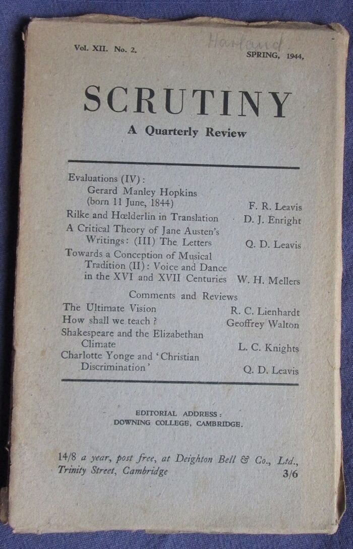 Paperback. Articles and reviews. Includes Gerard Manley Hopkins by F. R. Leavis; as well as Q. D. Leavis on Jane Austen’s letters, LC Knights on Shakespeare and the Elizabethan climate, Rilke and Hoelderlin in Translation by D. J. Enright, and Q. D. Leavis again on Charlotte Younge and Christian Discrimination, etc.
