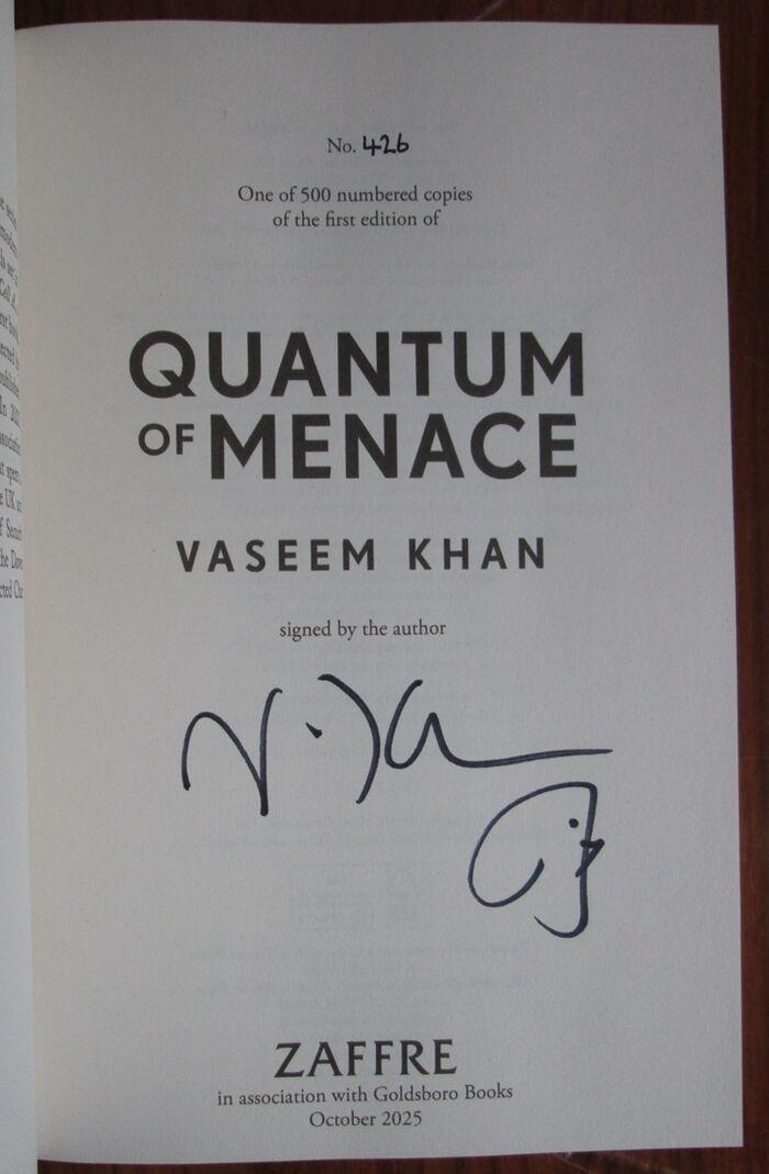 Hardback. Signed, first edition. One of 500 numbered copies of the first edition signed by the author. This is number 426. Sprayed edges. Historical detective fiction featuring Major Boothroyd, Q, from Ian Fleming’s James Bond series.