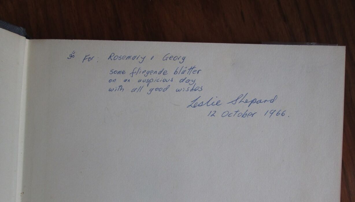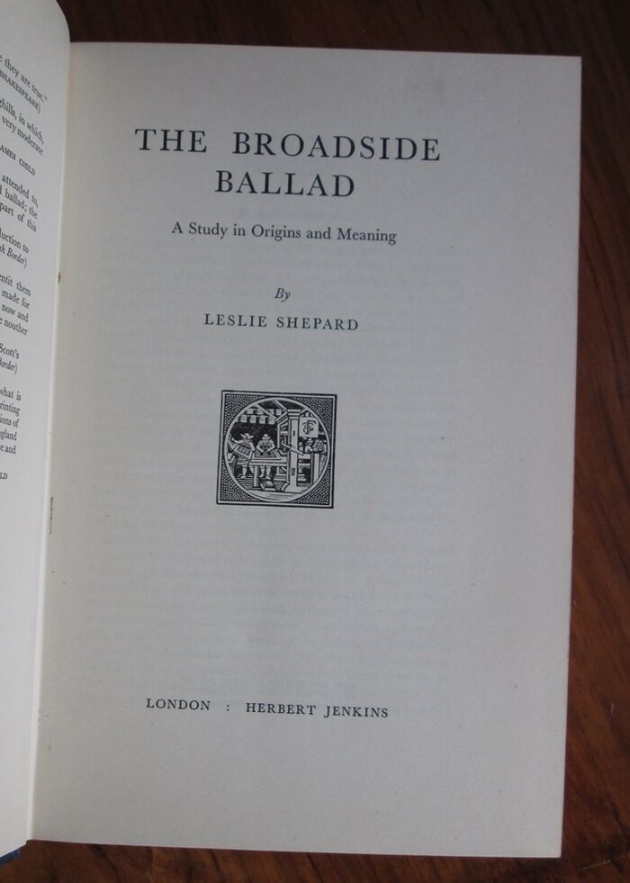 Hardback. 204pp. Signed first edition and inscribed by the author. On the development of the street ballad from traditional song to popular newspaper illustrated with over 60 facsimiles from the author’s extensive collection. There are further black and white illustrations throughout inlcuding headpieces and tailpieces to chapters and prints and woodcuts within the text. Signed and inscribed to the ffep “For Rosemary and Georg [sic] / Some filiegende blätter [filigree leaves] / on an auspicious day / with all good wishes / Leslie Shepard / 12 October 1966.” Indexed.