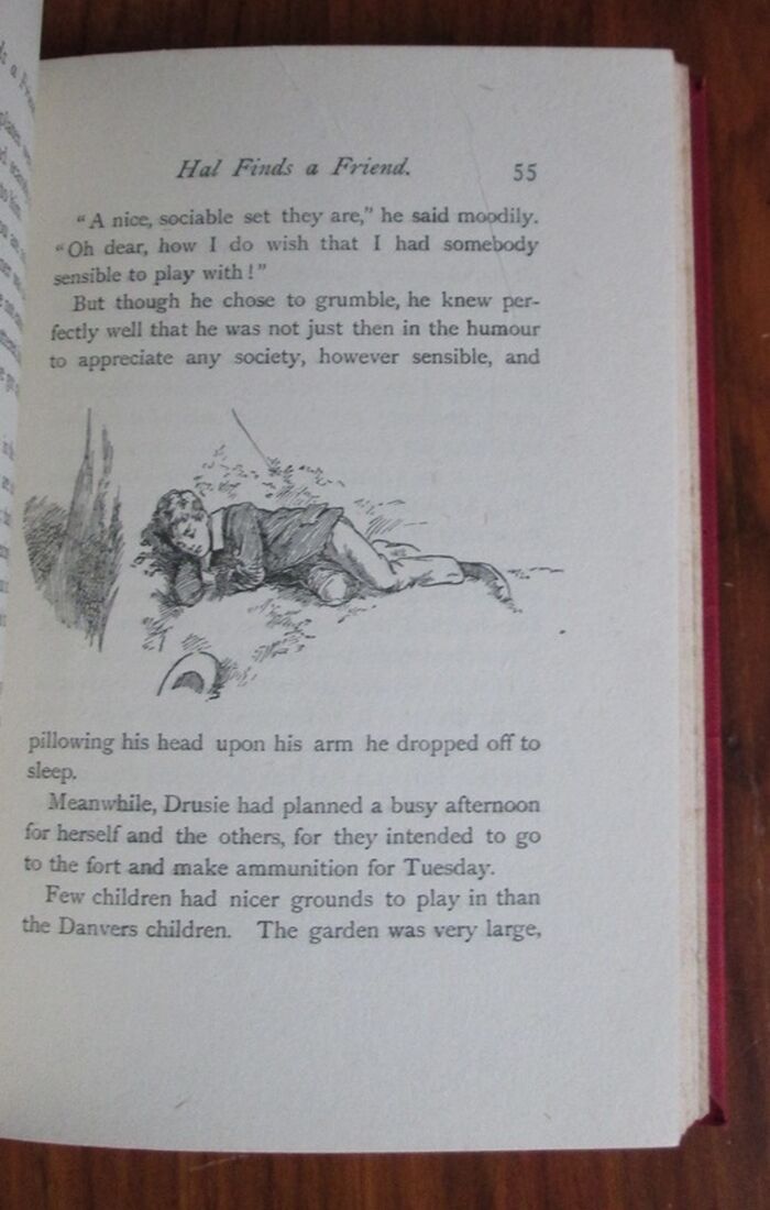 Hardback. Decorated red cloth with stylised leaf trailing pattern in white. Printed gilt label to spine with tile in relief. Colour frontis. Black white illustrated title and contents pages. Further black and white illustrations throughout, some full page. No date but prize book plate to endpaper dated 1912.