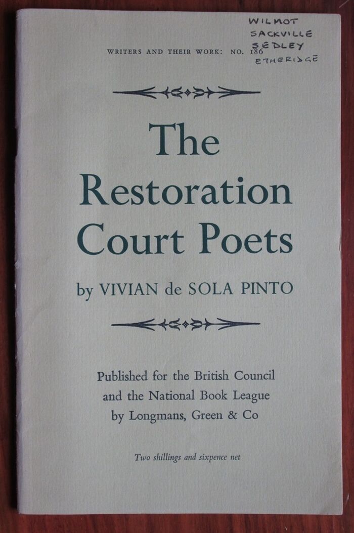 Paperback. 47pp. No. 186 in the Writers & Their Work series. Black and white frontis. Matt yellow card cover. Vivian de Sola Pinto was a poet and critic who appeared fro the defence in the 1960 Lady Chatterley's Lover trial.