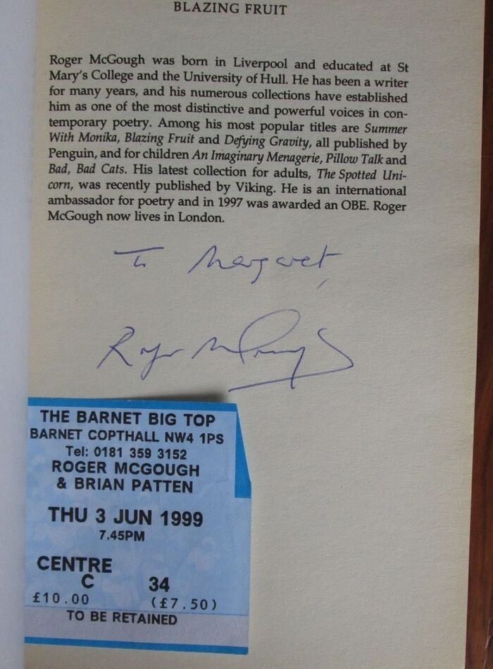 Paperback. 237pp. Poems. Signed and inscribed by Roger McGough to the first prelim, with ticket to a Roger McGough, Brian Patten event laid in.