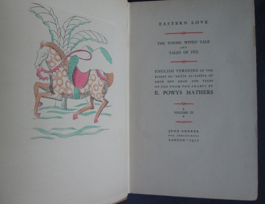 Published for subscribers and possibly individually bound by the customer. Marked volume II to the binding and contains Mathers Volume 4 (1927) Eastern Love: The Young Wives' Tale and Tales of Fez; Volume 5 (1928) Eastern Love: The Loves of Radha Krishna and Amores of Amaru and Mayura; Volume 6 (1928) Eastern Love: Love Stories and Gallant Tales from the Chinese. Illustrated with copper engravings by Hester Sainsbury and hand coloured by the printer. Hester Sainsbury and John Rodker were both modernists. Rodker was a poet and publisher who worked with Ezra Pound. He and fellow poet Hester Sainsbury were part of a group The Choric School. Sainsbury was a dancer and a painter and specialised in verse ad movement.