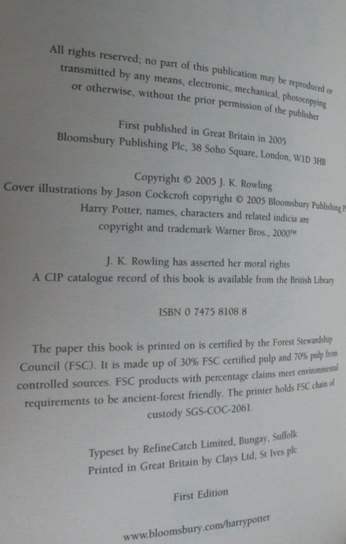 Hardback. First edition, first state with textual errors (corrected for later printings) as noted by Errington. The penultimate tale in the Harry Potter series. 607pp. Cover illustration by Jason Cockroft.